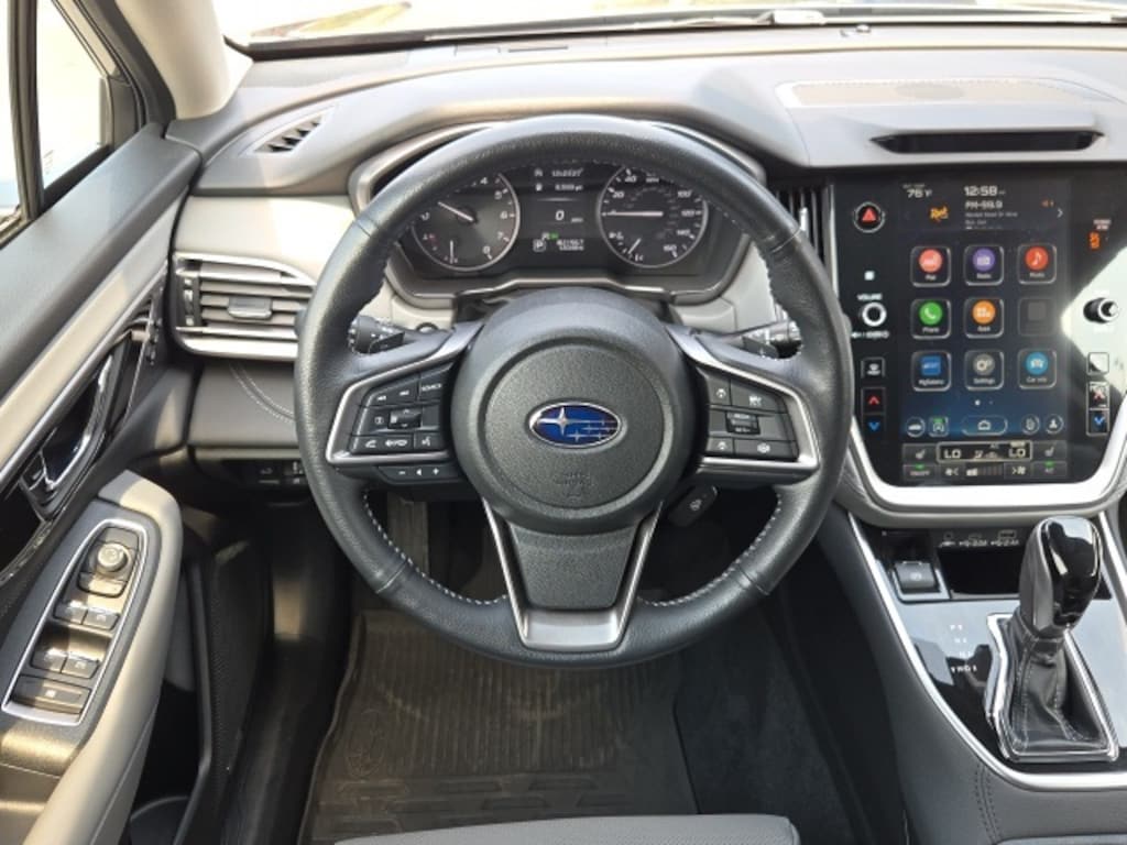 12 Speakers, 3.90 Axle Ratio, 4-Wheel Disc Brakes, ABS brakes, Air Conditioning, All-Weather Floor Liners, Alloy wheels, AM/FM radio: SiriusXM, Auto High-beam Headlights, Auto-dimming Rear-View mirror, Automatic temperature control, Brake assist, Bumpers: body-color, Cargo Net, Compass, Driver door bin, Driver vanity mirror, DriverFocus (Driver Monitoring System), Dual front impact airbags, Dual front side impact airbags, Electronic Stability Control, Emergency communication system: STARLINK Safety Plus (3-year free trial), Exterior Parking Camera Rear, Four wheel independent suspension, Front anti-roll bar, Front Bucket Seats, Front Center Armrest w/Storage, Front dual zone A/C, Front fog lights, Front reading lights, Fully automatic headlights, Garage door transmitter: HomeLink, harman/kardon® Speakers, Heated door mirrors, Heated Front Bucket Seats, Heated front seats, Heated rear seats, Heated Steering Wheel, Illuminated entry, Knee airbag, Leather Shift Knob, Leather steering wheel, Low tire pressure warning, Memory seat, Occupant sensing airbag, Outside temperature display, Overhead airbag, Overhead console, Panic alarm, Passenger door bin, Passenger vanity mirror, Perforated Leather-Trimmed Upholstery, Power door mirrors, Power driver seat, Power Liftgate, Power Moonroof, Power Moonroof & HSW & Navigation System, Power passenger seat, Power steering, Power windows, Radio: Subaru STARLINK 11.6" Multimedia Nav System, Radio: Subaru STARLINK 11.6" Multimedia Plus Sys, Rear anti-roll bar, Rear seat center armrest, Rear window defroster, Rear window wiper, Remote keyless entry, Roof rack, Security system, Speed control, Speed-sensing steering, Split folding rear seat, Spoiler, Steering wheel mounted audio controls, Steering Wheel Paddle Shift Control Switches, Tachometer, Telescoping steering wheel, Tilt steering wheel, Traction control, Trip computer, Turn signal indicator mirrors, Variably intermittent wipers, Wheels: 18" x 7J Black Aluminum Alloy. 2023 Subaru Outback Limited Gray AWD 2.5L 4-Cylinder DOHC 16V CVT Lineartronic