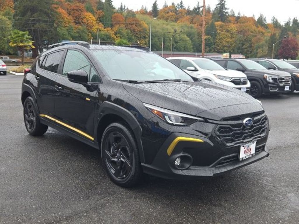 4-Wheel Disc Brakes, 6 Speakers, ABS brakes, Air Conditioning, Alloy wheels, AM/FM radio: SiriusXM, Anti-whiplash front head restraints, Auto High-beam Headlights, Automatic temperature control, Brake assist, Bumpers: body-color, Driver door bin, Driver vanity mirror, Dual front impact airbags, Dual front side impact airbags, Electronic Stability Control, Emergency communication system, Exterior Parking Camera Rear, Four wheel independent suspension, Front anti-roll bar, Front Bucket Seats, Front Center Armrest, Front dual zone A/C, Front fog lights, Front reading lights, Fully automatic headlights, Heated door mirrors, Heated Front Bucket Seats, Heated front seats, Illuminated entry, Knee airbag, Leather Shift Knob, Leather steering wheel, Low tire pressure warning, Occupant sensing airbag, Outside temperature display, Overhead airbag, Overhead console, Panic alarm, Passenger door bin, Passenger vanity mirror, Power door mirrors, Power steering, Power windows, Radio data system, Radio: Subaru 11.6" Multimedia Plus System, Rear anti-roll bar, Rear seat center armrest, Rear window defroster, Rear window wiper, Remote keyless entry, Security system, Speed control, Speed-sensing steering, Split folding rear seat, Spoiler, Sport Cloth Upholstery, Steering wheel mounted audio controls, Tachometer, Telescoping steering wheel, Tilt steering wheel, Traction control, Trip computer, Turn signal indicator mirrors, Variably intermittent wipers, Wheels: 18" x 7.0" J Dark Gray Aluminum-Alloy. 2025 Subaru Crosstrek Sport Crystal Black Silica AWD 2.5L 4-Cylinder DOHC 16V Lineartronic CVT