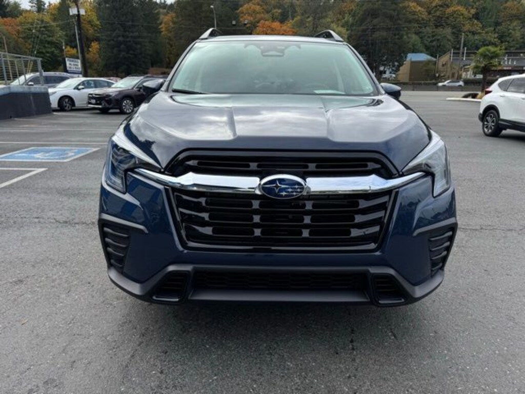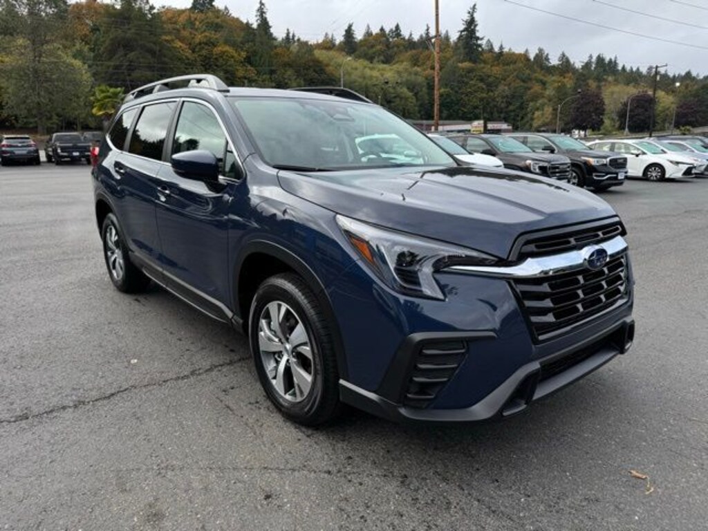Blue 2025 Subaru Ascent Premium AWD Lineartronic CVT 2.4L 4-Cylinder DOHC 16V 3rd row seats: bench, 4-Wheel Disc Brakes, 6 Speakers, ABS brakes, Air Conditioning, Alloy wheels, AM/FM radio: SiriusXM with 360L, Apple CarPlay & Android Auto, Auto High-beam Headlights, Auto-dimming Rear-View mirror, Automatic temperature control, Brake assist, Bumpers: body-color, Compass, Delay-off headlights, Driver door bin, Driver vanity mirror, Dual front impact airbags, Dual front side impact airbags, Electronic Stability Control, Emergency communication system: MySubaru Safety (3-year free trial), Exterior Parking Camera Rear, Four wheel independent suspension, Front anti-roll bar, Front Bucket Seats, Front Center Armrest, Front dual zone A/C, Front reading lights, Fully automatic headlights, Garage door transmitter: HomeLink, Heated door mirrors, Heated Front Bucket Seats, Heated front seats, Illuminated entry, Knee airbag, Leather Shift Knob, Leather steering wheel, Low tire pressure warning, Occupant sensing airbag, Outside temperature display, Overhead airbag, Overhead console, Panic alarm, Passenger door bin, Passenger vanity mirror, Power door mirrors, Power driver seat, Power Liftgate, Power steering, Power windows, Radio data system, Radio: Subaru 11.6" Multimedia Plus System, Rear air conditioning, Rear anti-roll bar, Rear reading lights, Rear window defroster, Rear window wiper, Reclining 3rd row seat, Remote keyless entry, Security system, Speed control, Speed-sensing steering, Spill Resistant Coated Cloth Upholstery, Split folding rear seat, Spoiler, Standard Model, Steering wheel mounted audio controls, Tachometer, Telescoping steering wheel, Tilt steering wheel, Traction control, Trip computer, Turn signal indicator mirrors, Variably intermittent wipers, Wheels: 18" x 7.5 J Gray Alloy w/Machine Finish.