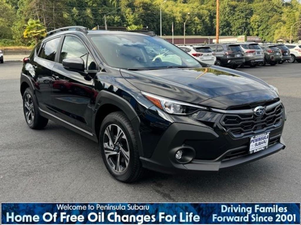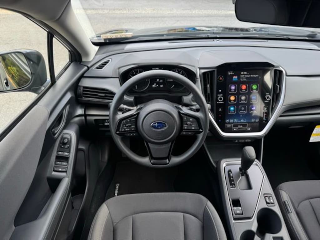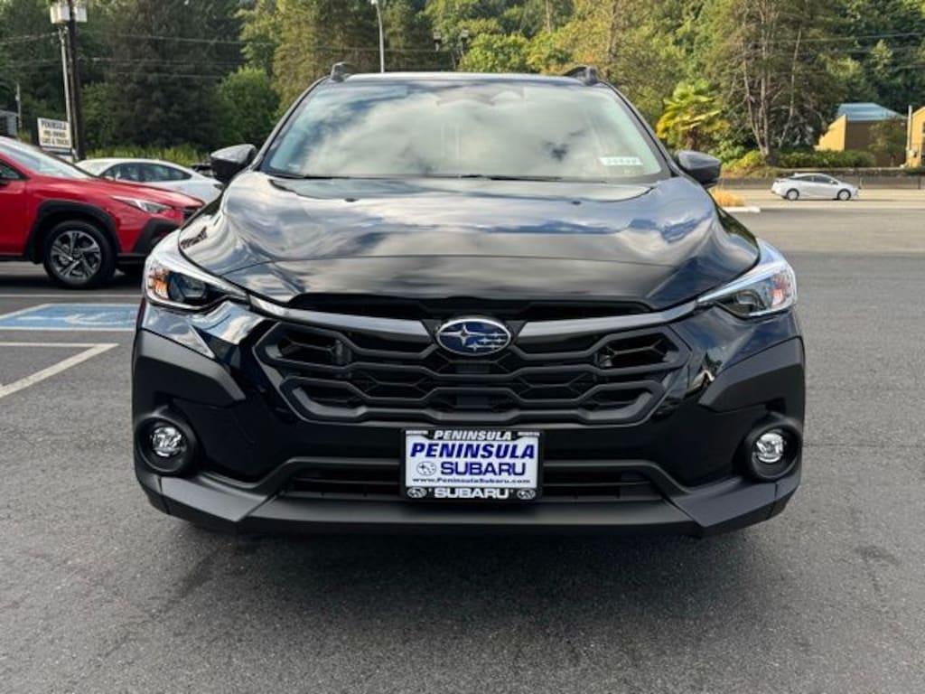Black / Silver 2025 Subaru Crosstrek Premium AWD Lineartronic CVT 2.5L 4-Cylinder DOHC 16V 4-Wheel Disc Brakes, 6 Speakers, ABS brakes, Air Conditioning, Alloy wheels, AM/FM radio: SiriusXM, Anti-whiplash front head restraints, Auto High-beam Headlights, Auto-Dimming Exterior Mirror w/Approach Light, Auto-Dimming Mirror w/Compass & HomeLink, Automatic temperature control, Brake assist, Bumpers: body-color, Cloth Upholstery, Crosstrek Mirror Package, Driver door bin, Driver vanity mirror, Dual front impact airbags, Dual front side impact airbags, Electronic Stability Control, Emergency communication system, Exterior Parking Camera Rear, Four wheel independent suspension, Front anti-roll bar, Front Bucket Seats, Front Center Armrest, Front dual zone A/C, Front fog lights, Front reading lights, Fully automatic headlights, Illuminated entry, Knee airbag, Low tire pressure warning, Occupant sensing airbag, Outside temperature display, Overhead airbag, Overhead console, Panic alarm, Passenger door bin, Passenger vanity mirror, Power door mirrors, Power steering, Power windows, Radio data system, Radio: Subaru 11.6" Multimedia Plus System, Rear anti-roll bar, Rear seat center armrest, Rear window defroster, Rear window wiper, Remote keyless entry, Security system, Speed control, Speed-sensing steering, Split folding rear seat, Spoiler, Steering wheel mounted audio controls, Tachometer, Telescoping steering wheel, Tilt steering wheel, Traction control, Trip computer, Turn signal indicator mirrors, Variably intermittent wipers, Wheels: 17" x 7.0" J Machine Finish Aluminum-Alloy.