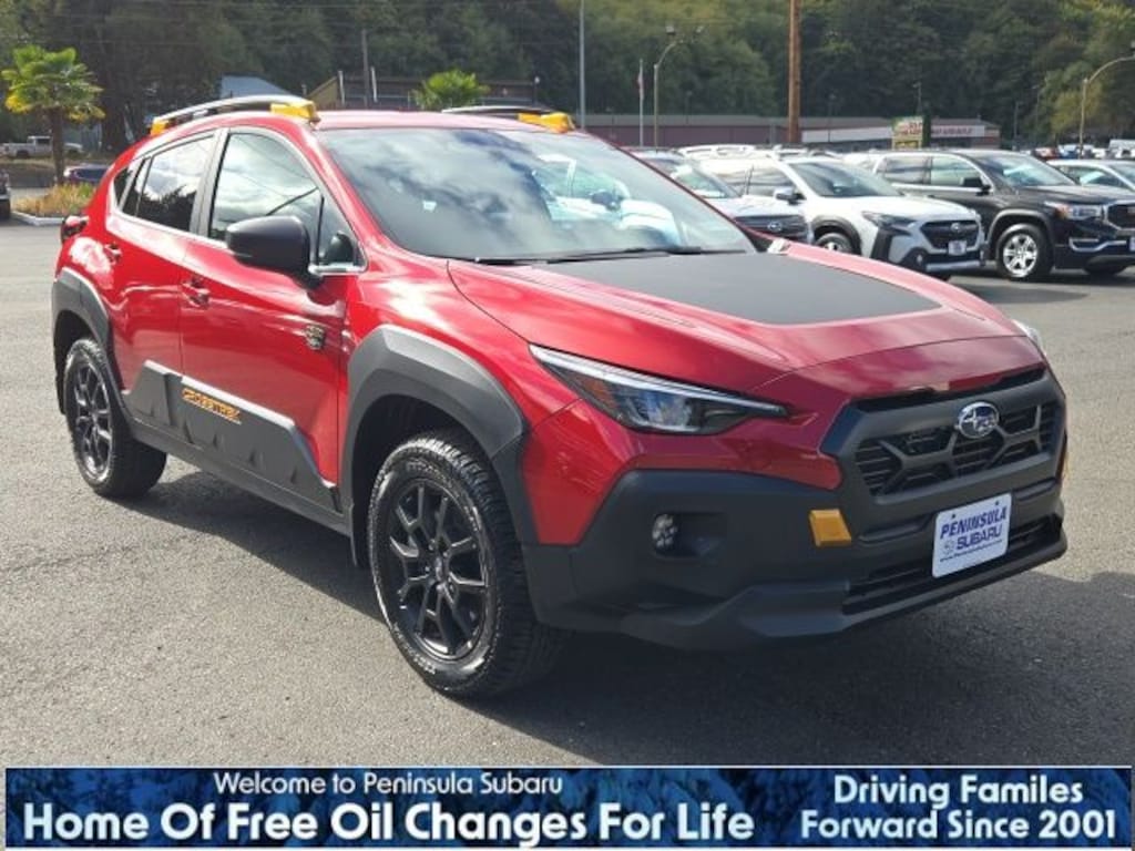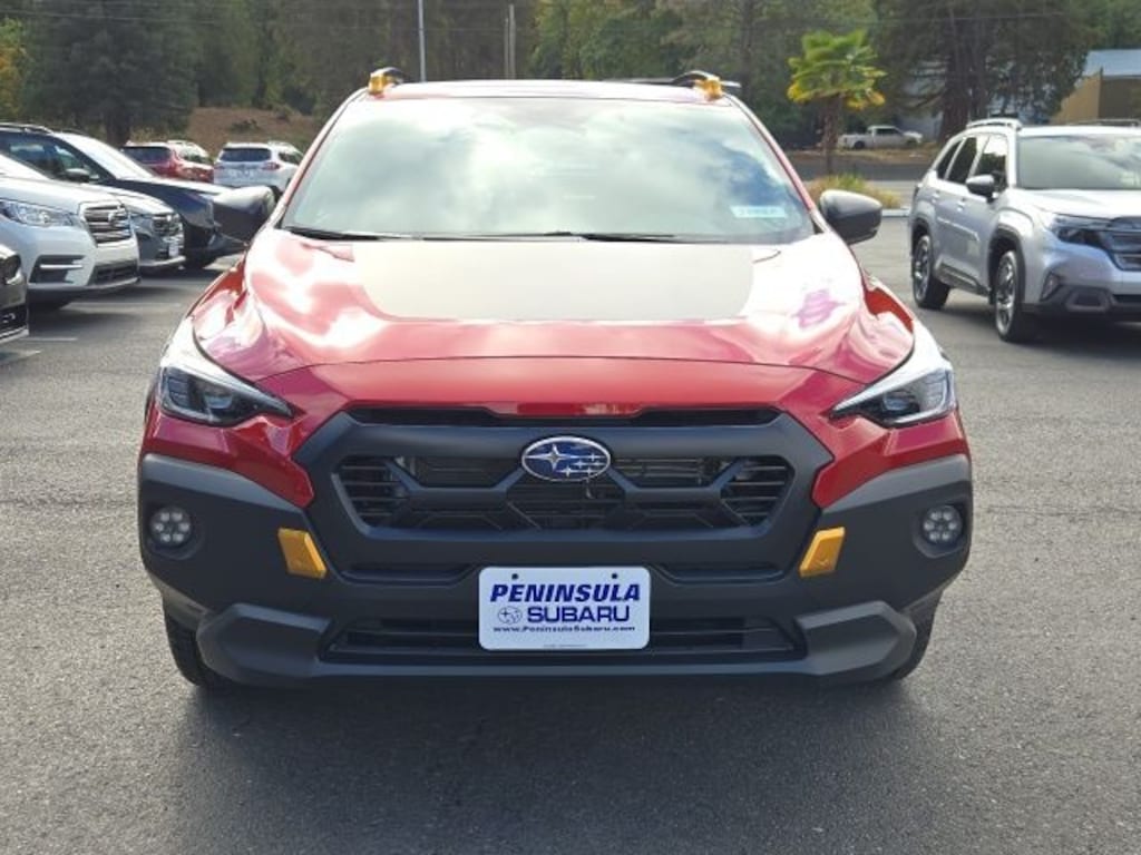 Red 2025 Subaru Crosstrek Wilderness AWD Lineartronic CVT 2.5L 4-Cylinder DOHC 16V 4-Wheel Disc Brakes, 6 Speakers, ABS brakes, Air Conditioning, Alloy wheels, AM/FM radio: SiriusXM, Anti-whiplash front head restraints, Auto High-beam Headlights, Auto-Dimming Exterior Mirror w/Approach Light, Auto-Dimming Mirror w/Compass & HomeLink, Automatic temperature control, Brake assist, Bumpers: body-color, Crosstrek Mirror Package, Driver door bin, Driver vanity mirror, Dual front impact airbags, Dual front side impact airbags, Electronic Stability Control, Emergency communication system, Exterior Parking Camera Rear, Four wheel independent suspension, Front anti-roll bar, Front Bucket Seats, Front Center Armrest, Front dual zone A/C, Front fog lights, Front reading lights, Fully automatic headlights, Heated door mirrors, Heated Front Bucket Seats, Heated front seats, Illuminated entry, Knee airbag, Leather Shift Knob, Leather steering wheel, LED Upgrade, Low tire pressure warning, Occupant sensing airbag, Outside temperature display, Overhead airbag, Overhead console, Panic alarm, Passenger door bin, Passenger vanity mirror, Power door mirrors, Power steering, Power windows, Radio data system, Radio: Subaru 11.6" Multimedia Plus System, Rear anti-roll bar, Rear Bumper Cover - Wilderness, Rear seat center armrest, Rear window defroster, Rear window wiper, Remote keyless entry, Security system, Speed control, Speed-sensing steering, Splash Guards - Wilderness, Split folding rear seat, Spoiler, Steering wheel mounted audio controls, Tachometer, Telescoping steering wheel, Tilt steering wheel, Traction control, Trip computer, Turn signal indicator mirrors, Variably intermittent wipers, Wheels: 17" x 7.0" J Matte Black Aluminum-Alloy, Wilderness StarTex Upholstery.