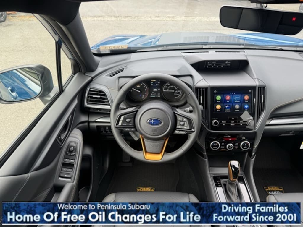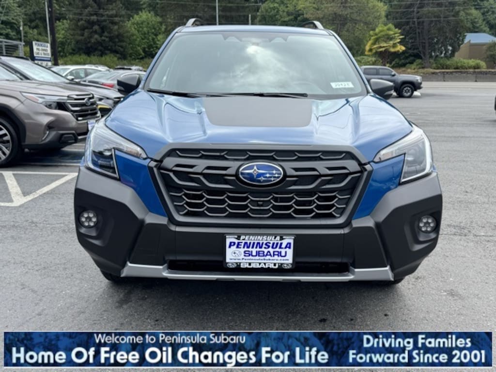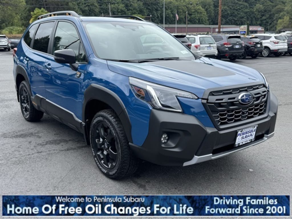Blue 2025 Subaru Forester Wilderness AWD Lineartronic CVT 2.5L 4-Cylinder DOHC 16V 4-Wheel Disc Brakes, 6 Speakers, ABS brakes, Air Conditioning, Alloy wheels, AM/FM radio: SiriusXM, Anti-whiplash front head restraints, Auto High-beam Headlights, Auto-Dimming Exterior Mirror w/Approach Light, Auto-Dimming Mirror w/Compass & HomeLink, Automatic temperature control, Brake assist, Bumpers: body-color, Cargo Sidewall Protector, Door Projector Lights, Driver door bin, Driver vanity mirror, Dual front impact airbags, Dual front side impact airbags, Electronic Stability Control, Emergency communication system: MySubaru Safety (3-year free trial), Exterior Parking Camera Rear, Four wheel independent suspension, Front anti-roll bar, Front Bucket Seats, Front Center Armrest, Front dual zone A/C, Front fog lights, Front reading lights, Fully automatic headlights, Heated door mirrors, Heated Front Bucket Seats, Heated front seats, Illuminated entry, Knee airbag, Leather Shift Knob, Leather steering wheel, Low tire pressure warning, Occupant sensing airbag, Outside temperature display, Overhead airbag, Overhead console, Panic alarm, Passenger door bin, Passenger vanity mirror, Power door mirrors, Power driver seat, Power moonroof: Panoramic, Power steering, Power windows, Radio data system, Radio: Subaru 8.0" Multimedia Plus System, Rear anti-roll bar, Rear Bumper Cover, Rear seat center armrest, Rear window defroster, Rear window wiper, Remote keyless entry, Security system, Speed control, Speed-sensing steering, Splash Guards - Wilderness, Split folding rear seat, Spoiler, Steering wheel mounted audio controls, Tachometer, Telescoping steering wheel, Textured StarTex Upholstery, Tilt steering wheel, Traction control, Trip computer, Turn signal indicator mirrors, Variably intermittent wipers, Wheels: 17" x 7.0 J Matte Black Finish Alum-Alloy.