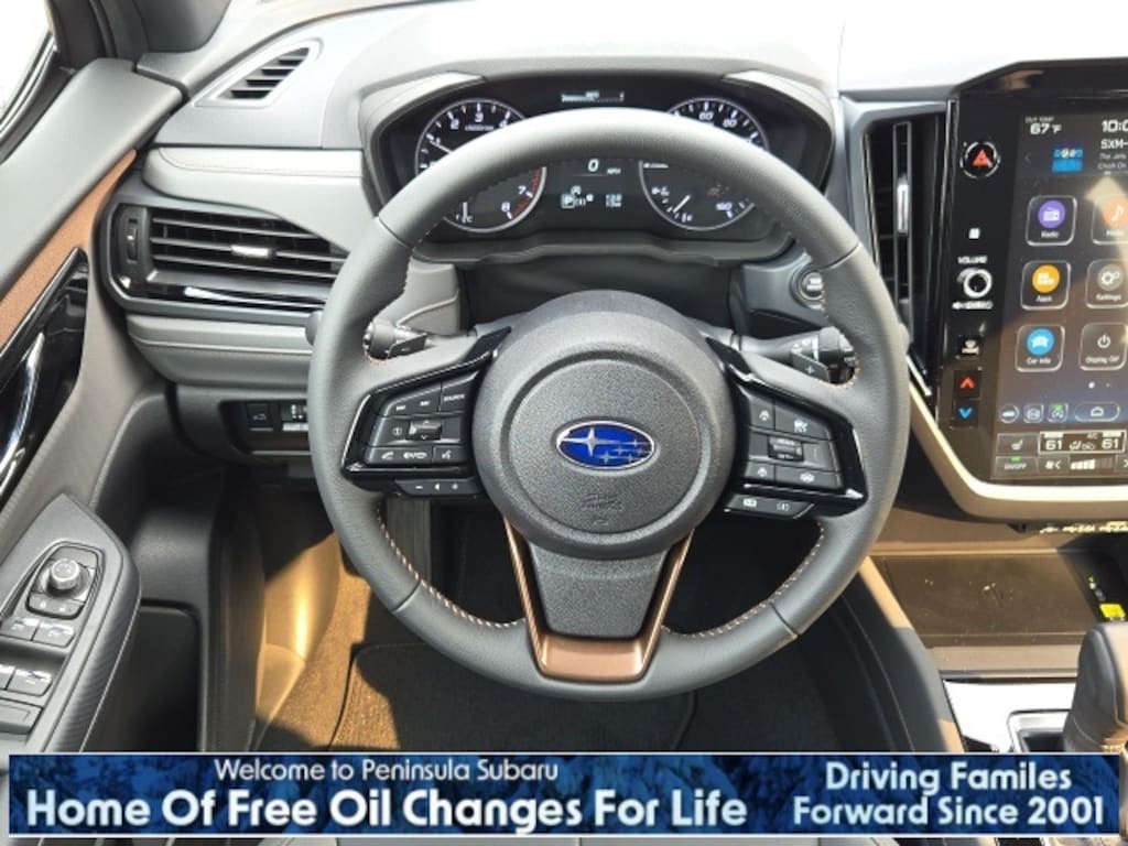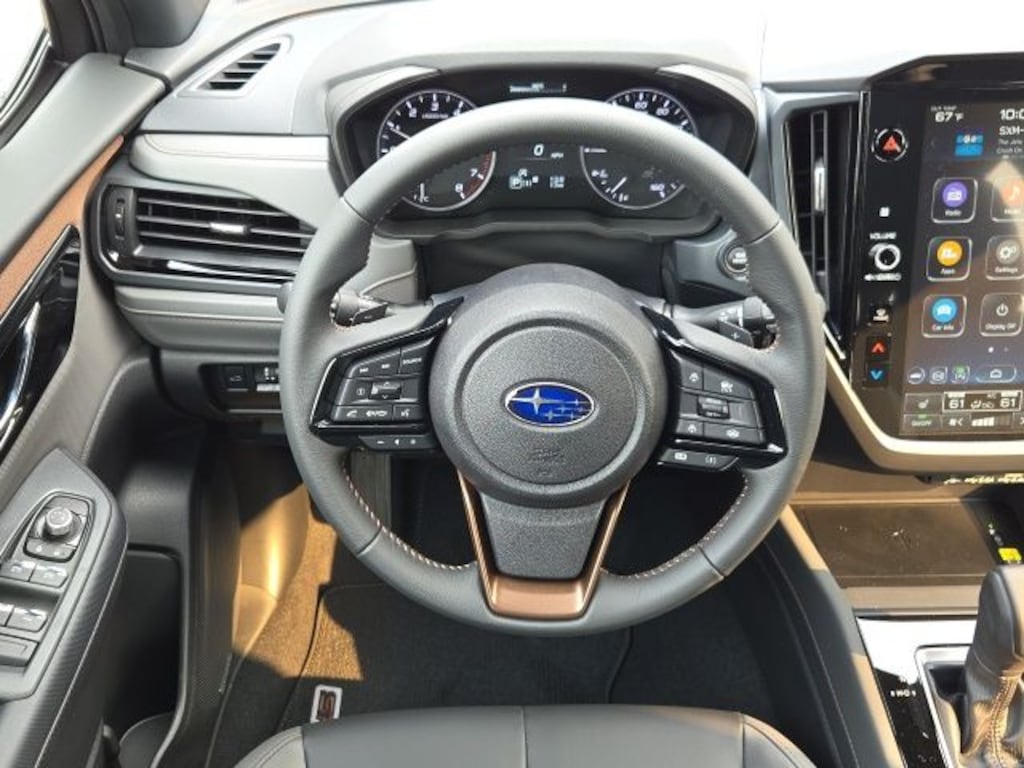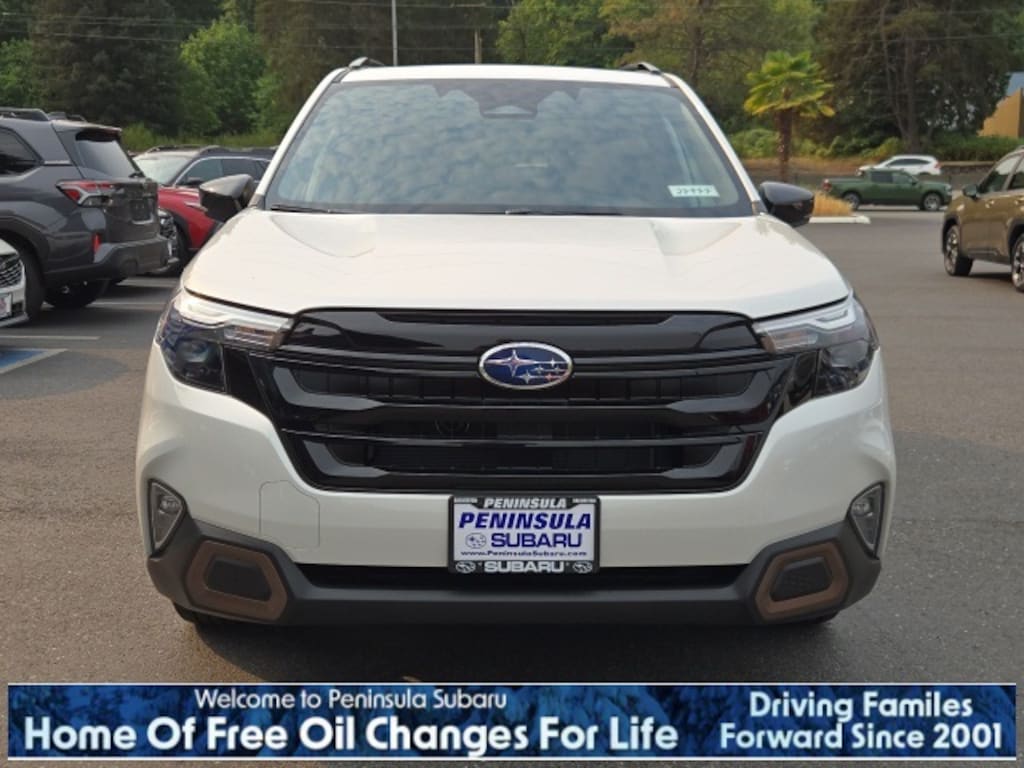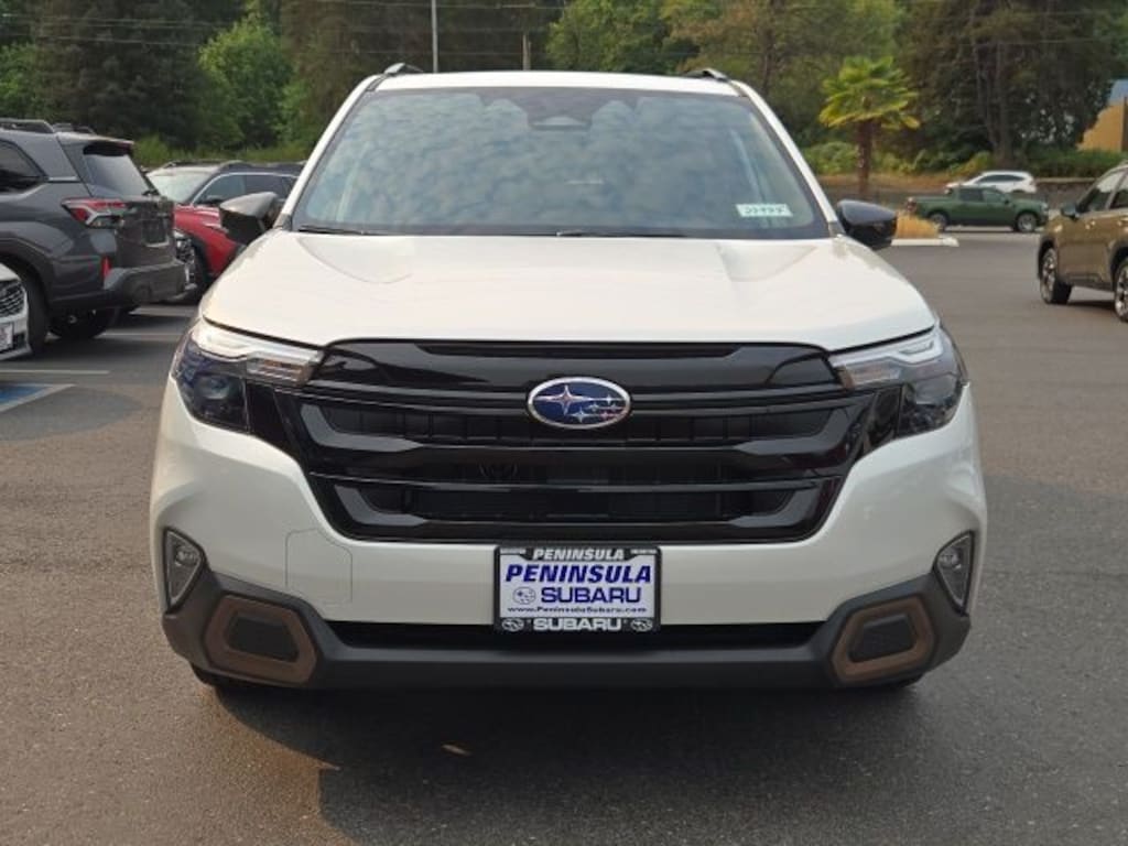 White Pearl 2025 Subaru Forester Sport AWD Lineartronic CVT 2.5L 4-Cylinder DOHC 16V 4-Wheel Disc Brakes, 6 Speakers, ABS brakes, Air Conditioning, Alloy wheels, AM/FM radio: SiriusXM with 360L, Anti-whiplash front head restraints, Auto High-beam Headlights, Auto-Dimming Exterior Mirror w/Approach Light, Auto-Dimming Mirror w/Compass & HomeLink, Automatic temperature control, Body Side Molding - Crystal White Pearl, Brake assist, Bumpers: body-color, Cargo Tray, Driver door bin, Driver vanity mirror, Dual front impact airbags, Dual front side impact airbags, Electronic Stability Control, Emergency communication system: MySubaru Safety (3-year free trial), Exterior Parking Camera Rear, Four wheel independent suspension, Front anti-roll bar, Front Bucket Seats, Front Center Armrest, Front dual zone A/C, Front fog lights, Front reading lights, Fully automatic headlights, Heated door mirrors, Heated Front Bucket Seats, Heated front seats, Illuminated entry, Knee airbag, Leather steering wheel, Low tire pressure warning, Occupant sensing airbag, Outside temperature display, Overhead airbag, Overhead console, Panic alarm, Passenger door bin, Passenger vanity mirror, Power door mirrors, Power driver seat, Power moonroof: Panoramic, Power steering, Power windows, Radio data system, Radio: Subaru 11.6" Multimedia Plus System, Rear anti-roll bar, Rear seat center armrest, Rear window defroster, Rear window wiper, Remote keyless entry, Security system, Speed control, Speed-sensing steering, Splash Guards, Split folding rear seat, Spoiler, Sport StarTex Upholstery, Steering wheel mounted audio controls, Tachometer, Telescoping steering wheel, Tilt steering wheel, Traction control, Trip computer, Turn signal indicator mirrors, Variably intermittent wipers, Wheels: 19" x 7.5 J Bronze Finish Aluminum-Alloy.