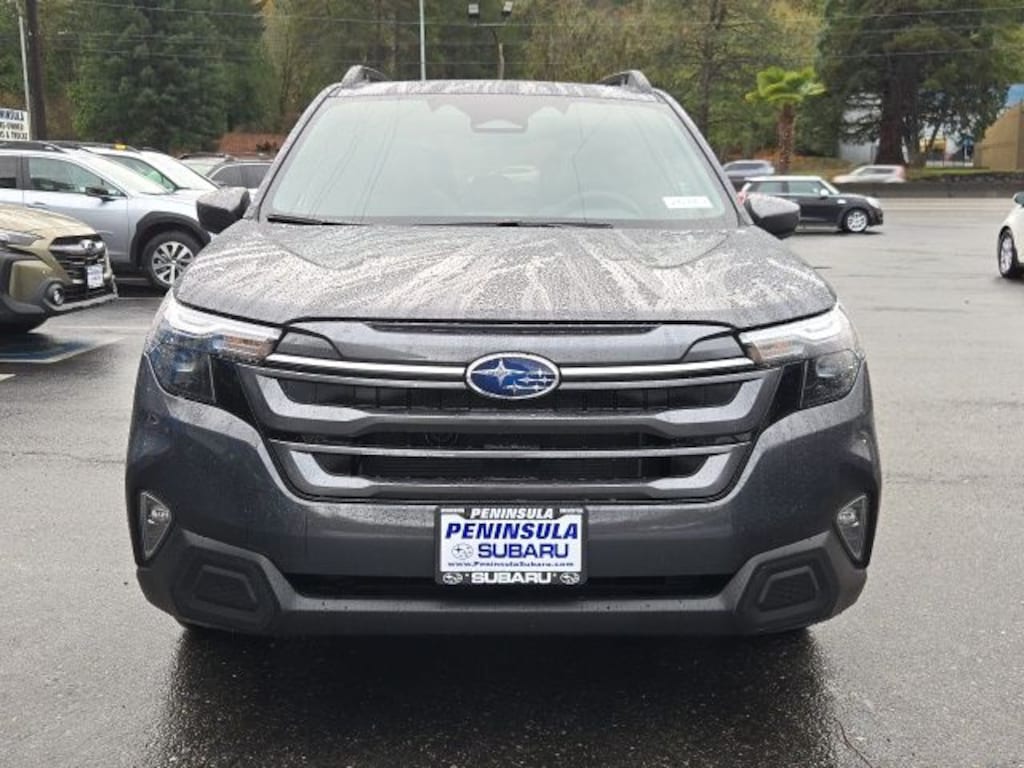Gray 2025 Subaru Forester Premium AWD Lineartronic CVT 2.5L 4-Cylinder DOHC 16V 4-Wheel Disc Brakes, 6 Speakers, ABS brakes, Air Conditioning, Alloy wheels, AM/FM radio: SiriusXM with 360L, Anti-whiplash front head restraints, Auto High-beam Headlights, Auto-Dimming Exterior Mirror w/Approach Light, Auto-Dimming Mirror w/Compass & HomeLink, Automatic temperature control, Brake assist, Bumpers: body-color, Cargo Tray, Driver door bin, Driver vanity mirror, Dual front impact airbags, Dual front side impact airbags, Electronic Stability Control, Emergency communication system: MySubaru Safety (3-year free trial), Exterior Parking Camera Rear, Four wheel independent suspension, Front anti-roll bar, Front Bucket Seats, Front Center Armrest, Front dual zone A/C, Front fog lights, Front reading lights, Fully automatic headlights, Heated door mirrors, Heated Front Bucket Seats, Heated front seats, Illuminated entry, Knee airbag, Leather steering wheel, Low tire pressure warning, Occupant sensing airbag, Outside temperature display, Overhead airbag, Overhead console, Panic alarm, Passenger door bin, Passenger vanity mirror, Power door mirrors, Power driver seat, Power moonroof: Panoramic, Power steering, Power windows, Premium Textured Cloth Upholstery, Radio data system, Radio: Subaru 11.6" Multimedia Plus System, Rear anti-roll bar, Rear seat center armrest, Rear window defroster, Rear window wiper, Remote keyless entry, Security system, Speed control, Speed-sensing steering, Split folding rear seat, Spoiler, Standard Model, Steering wheel mounted audio controls, Tachometer, Telescoping steering wheel, Tilt steering wheel, Traction control, Trip computer, Variably intermittent wipers, Wheels: 17" x 7.0 J Dark Metallic Aluminum-Alloy.
