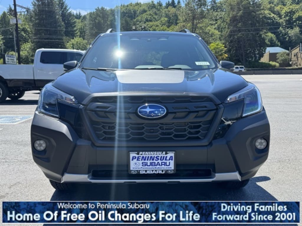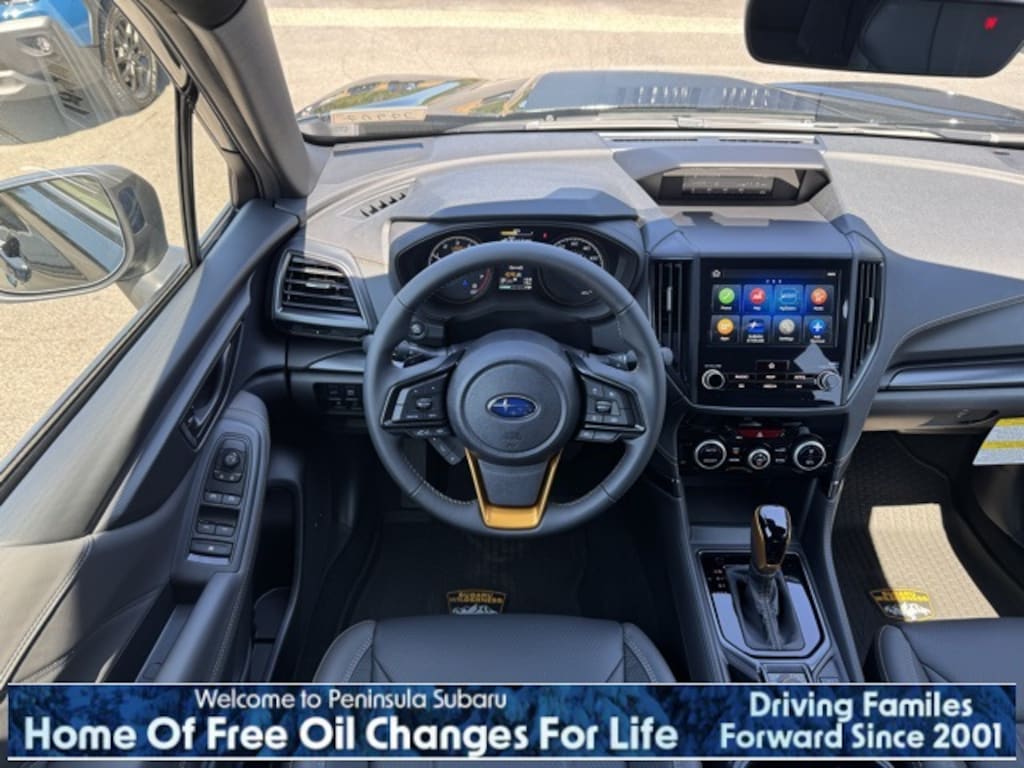 Black / Silver 2025 Subaru Forester Wilderness AWD Lineartronic CVT 2.5L 4-Cylinder DOHC 16V 4-Wheel Disc Brakes, 6 Speakers, ABS brakes, Air Conditioning, Alloy wheels, AM/FM radio: SiriusXM, Anti-whiplash front head restraints, Auto High-beam Headlights, Auto-Dimming Exterior Mirror w/Approach Light, Auto-Dimming Mirror w/Compass & HomeLink, Automatic temperature control, Body Side Molding - Crystal Black Silica, Brake assist, Bumpers: body-color, Cargo Sidewall Protector, Door Projector Lights, Driver door bin, Driver vanity mirror, Dual front impact airbags, Dual front side impact airbags, Electronic Stability Control, Emergency communication system: STARLINK Safety and Security (Subscription Required), Exterior Parking Camera Rear, Four wheel independent suspension, Front anti-roll bar, Front Bucket Seats, Front Center Armrest, Front dual zone A/C, Front fog lights, Front reading lights, Fully automatic headlights, Heated door mirrors, Heated Front Bucket Seats, Heated front seats, Illuminated entry, Knee airbag, Leather Shift Knob, Leather steering wheel, Low tire pressure warning, Occupant sensing airbag, Outside temperature display, Overhead airbag, Overhead console, Panic alarm, Passenger door bin, Passenger vanity mirror, Power door mirrors, Power driver seat, Power moonroof: Panoramic, Power steering, Power windows, Radio data system, Radio: Subaru STARLINK 8.0" Multimedia Plus System, Rear anti-roll bar, Rear Bumper Cover, Rear seat center armrest, Rear window defroster, Rear window wiper, Remote keyless entry, Security system, Speed control, Speed-sensing steering, Splash Guards - Wilderness, Split folding rear seat, Spoiler, STARLINK/Apple CarPlay/Android Auto, Steering wheel mounted audio controls, Tachometer, Telescoping steering wheel, Textured StarTex Upholstery, Tilt steering wheel, Traction control, Trip computer, Turn signal indicator mirrors, Variably intermittent wipers, Wheels: 17" x 7.0 J Matte Black Finish Alum-Alloy.
