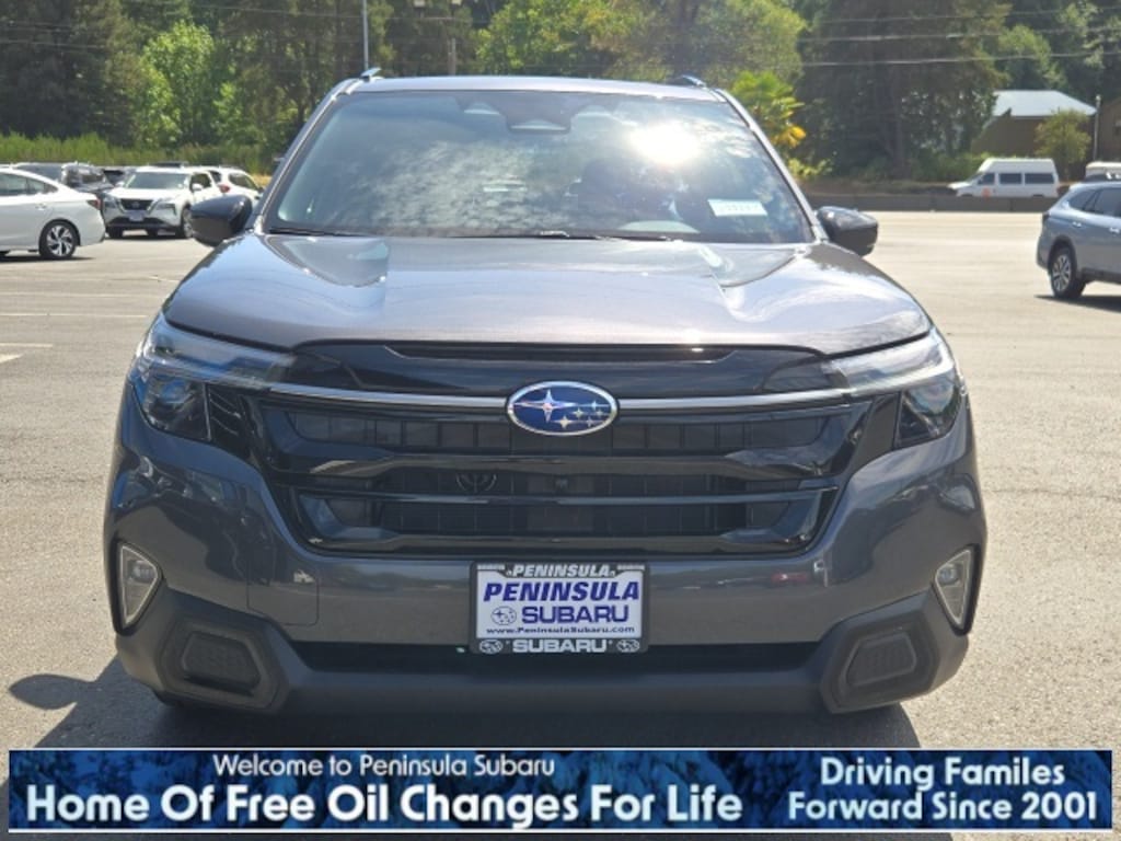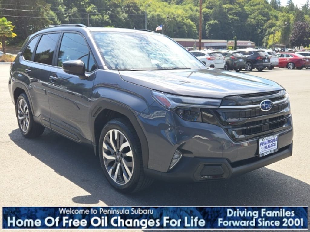 Gray 2025 Subaru Forester Touring AWD Lineartronic CVT 2.5L 4-Cylinder DOHC 16V 11 Speakers, 4-Wheel Disc Brakes, ABS brakes, Air Conditioning, Alloy wheels, AM/FM radio: SiriusXM with 360L, Anti-whiplash front head restraints, Auto High-beam Headlights, Auto-Dimming Exterior Mirror w/Approach Light, Automatic temperature control, Body Side Molding - Magnetite Gray Metallic, Brake assist, Bumpers: body-color, Center Console Tray, Door Projector Lights, Driver door bin, Driver vanity mirror, Dual front impact airbags, Dual front side impact airbags, Electronic Stability Control, Emergency communication system: MySubaru Safety (3-year free trial), Exterior Parking Camera Rear, Four wheel independent suspension, Front anti-roll bar, Front Bucket Seats, Front Center Armrest, Front dual zone A/C, Front fog lights, Front reading lights, Fully automatic headlights, harman/kardon® Speakers, Heated & Ventilated Front Bucket Seats, Heated door mirrors, Heated front seats, Heated rear seats, Heated steering wheel, HVAC memory, Illuminated entry, Knee airbag, Leather steering wheel, LED Upgrade, Low tire pressure warning, Memory seat, Navigation System, Occupant sensing airbag, Outside temperature display, Overhead airbag, Overhead console, Panic alarm, Passenger door bin, Passenger vanity mirror, Perforated Leather-Trimmed Upholstery, Power door mirrors, Power driver seat, Power Liftgate, Power moonroof: Panoramic, Power passenger seat, Power steering, Power windows, Radio data system, Radio: Subaru 11.6" Multimedia Navigation System, Rear anti-roll bar, Rear Bumper Cover, Rear seat center armrest, Rear window defroster, Rear window wiper, Remote keyless entry, Security system, Speed control, Speed-sensing steering, Splash Guards, Split folding rear seat, Spoiler, Standard Model, Steering wheel mounted audio controls, Sunshade - 2nd Row, Tachometer, Telescoping steering wheel, Tilt steering wheel, Traction control, Trip computer, Turn signal indicator mirrors, Variably intermittent wipers, Ventilated front seats, Wheels: 19" x 7.5 J Dark Gray Aluminum-Alloy.
