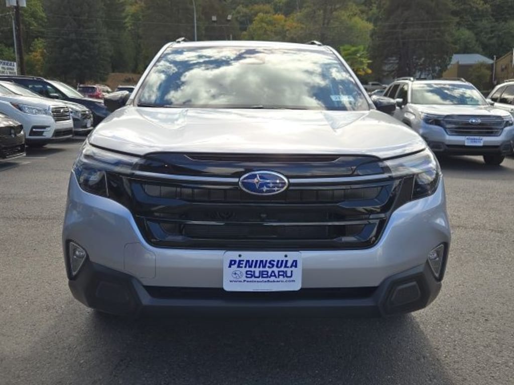 Silver Metallic 2025 Subaru Forester Touring AWD Lineartronic CVT 2.5L 4-Cylinder DOHC 16V 11 Speakers, 4-Wheel Disc Brakes, ABS brakes, Air Conditioning, Alloy wheels, AM/FM radio: SiriusXM with 360L, Anti-whiplash front head restraints, Auto High-beam Headlights, Auto-Dimming Exterior Mirror w/Approach Light, Automatic temperature control, Body Side Molding - Ice Silver Metallic, Brake assist, Bumpers: body-color, Cargo Tray, Door Projector Lights, Driver door bin, Driver vanity mirror, Dual front impact airbags, Dual front side impact airbags, Electronic Stability Control, Emergency communication system: MySubaru Safety (3-year free trial), Exterior Parking Camera Rear, Four wheel independent suspension, Front anti-roll bar, Front Bucket Seats, Front Center Armrest, Front dual zone A/C, Front fog lights, Front reading lights, Fully automatic headlights, harman/kardon® Speakers, Heated & Ventilated Front Bucket Seats, Heated door mirrors, Heated front seats, Heated rear seats, Heated steering wheel, HVAC memory, Illuminated entry, Knee airbag, Leather steering wheel, LED Upgrade, Low tire pressure warning, Memory seat, Navigation System, Occupant sensing airbag, Outside temperature display, Overhead airbag, Overhead console, Panic alarm, Passenger door bin, Passenger vanity mirror, Perforated Leather-Trimmed Upholstery, Power door mirrors, Power driver seat, Power Liftgate, Power moonroof: Panoramic, Power passenger seat, Power steering, Power windows, Radio data system, Radio: Subaru 11.6" Multimedia Navigation System, Rear anti-roll bar, Rear seat center armrest, Rear window defroster, Rear window wiper, Remote keyless entry, Security system, Speed control, Speed-sensing steering, Splash Guards, Split folding rear seat, Spoiler, Steering wheel mounted audio controls, Tachometer, Telescoping steering wheel, Tilt steering wheel, Traction control, Trip computer, Turn signal indicator mirrors, Variably intermittent wipers, Ventilated front seats, Wheels: 19" x 7.5 J Dark Gray Aluminum-Alloy.
