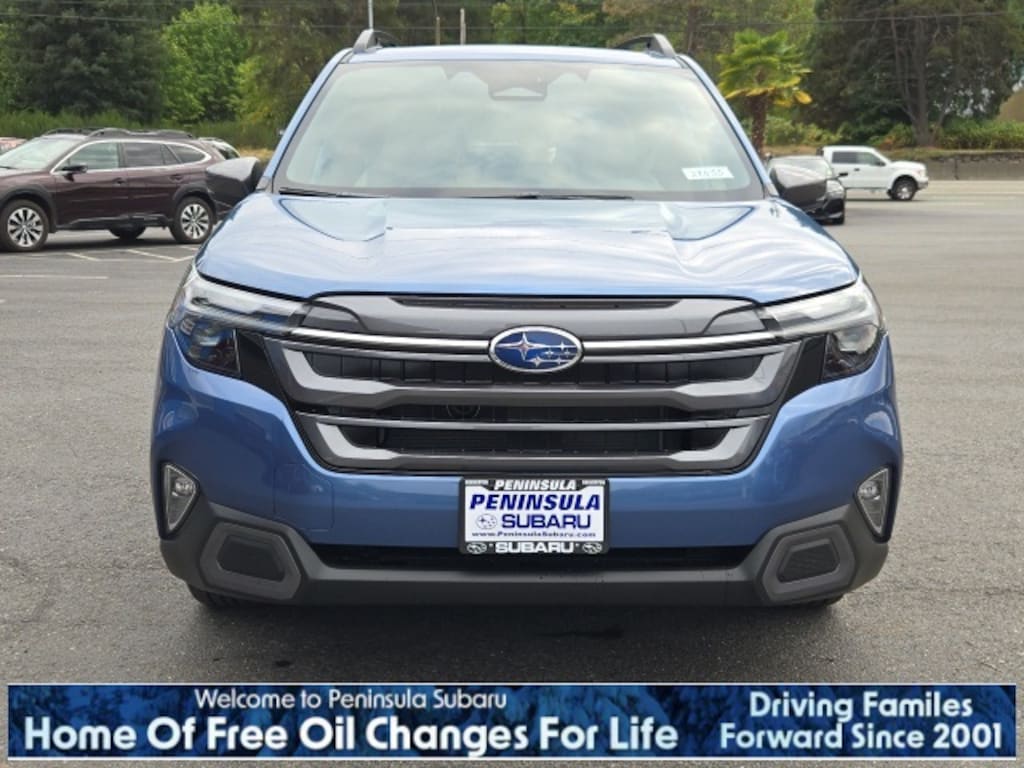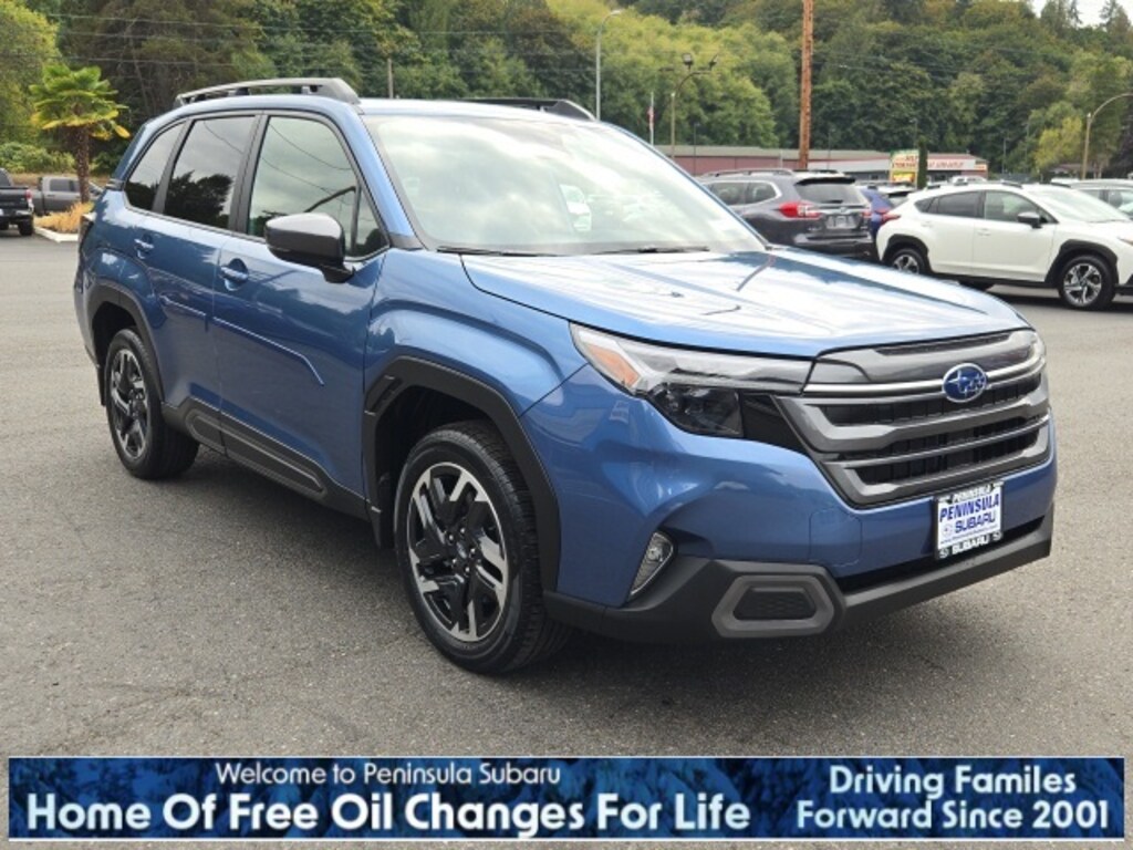 Blue 2025 Subaru Forester Limited AWD Lineartronic CVT 2.5L 4-Cylinder DOHC 16V 4-Wheel Disc Brakes, 6 Speakers, ABS brakes, Air Conditioning, Alloy wheels, AM/FM radio: SiriusXM with 360L, Anti-whiplash front head restraints, Auto High-beam Headlights, Auto-Dimming Exterior Mirror w/Approach Light, Auto-Dimming Mirror w/Compass & HomeLink, Automatic temperature control, Body Side Molding - Horizon Blue Pearl, Brake assist, Bumpers: body-color, Cargo Tray, Driver door bin, Driver vanity mirror, Dual front impact airbags, Dual front side impact airbags, Electronic Stability Control, Emergency communication system: MySubaru Safety (3-year free trial), Exterior Parking Camera Rear, Four wheel independent suspension, Front anti-roll bar, Front Bucket Seats, Front Center Armrest, Front dual zone A/C, Front fog lights, Front reading lights, Fully automatic headlights, Heated door mirrors, Heated Front Bucket Seats, Heated front seats, Heated steering wheel, Illuminated entry, Knee airbag, Leather steering wheel, Low tire pressure warning, Occupant sensing airbag, Outside temperature display, Overhead airbag, Overhead console, Panic alarm, Passenger door bin, Passenger vanity mirror, Perforated Leather-Trimmed Upholstery, Power door mirrors, Power driver seat, Power Liftgate, Power moonroof: Panoramic, Power passenger seat, Power steering, Power windows, Radio data system, Radio: Subaru 11.6" Multimedia Plus System, Rear anti-roll bar, Rear seat center armrest, Rear window defroster, Rear window wiper, Remote keyless entry, Security system, Speed control, Speed-sensing steering, Splash Guards, Split folding rear seat, Spoiler, Steering wheel mounted audio controls, Tachometer, Telescoping steering wheel, Tilt steering wheel, Traction control, Trip computer, Turn signal indicator mirrors, Variably intermittent wipers, Wheels: 18" x 7.0 J Dark Metallic Aluminum-Alloy.