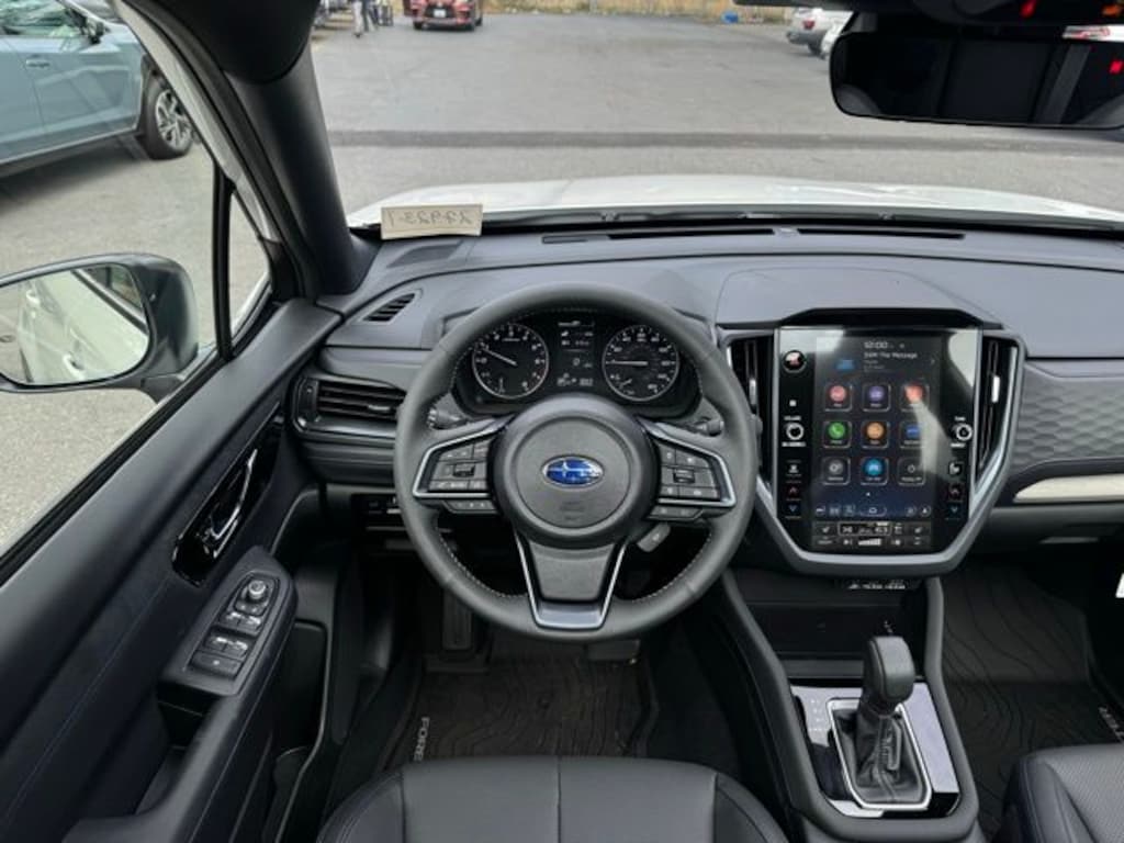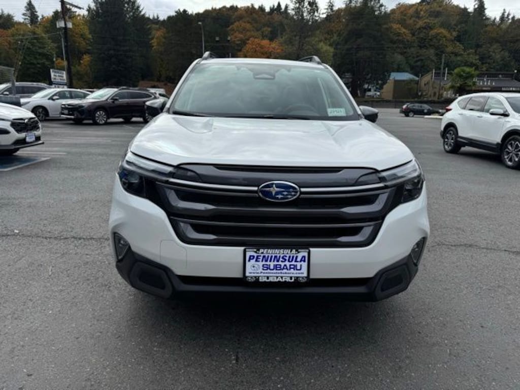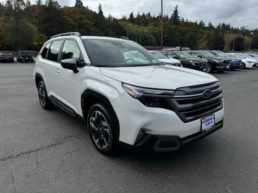 White Pearl 2025 Subaru Forester Limited AWD Lineartronic CVT 2.5L 4-Cylinder DOHC 16V 4-Wheel Disc Brakes, 6 Speakers, ABS brakes, Air Conditioning, All-Weather Floor Liners, Alloy wheels, AM/FM radio: SiriusXM with 360L, Anti-whiplash front head restraints, Auto High-beam Headlights, Auto-Dimming Exterior Mirror w/Approach Light, Auto-Dimming Mirror w/Compass & HomeLink, Automatic temperature control, Brake assist, Bumpers: body-color, Cargo Tray, Driver door bin, Driver vanity mirror, Dual front impact airbags, Dual front side impact airbags, Electronic Stability Control, Emergency communication system: MySubaru Safety (3-year free trial), Exterior Parking Camera Rear, Four wheel independent suspension, Front anti-roll bar, Front Bucket Seats, Front Center Armrest, Front dual zone A/C, Front fog lights, Front reading lights, Fully automatic headlights, harman/kardon Audio & Navigation & RAB, Heated door mirrors, Heated Front Bucket Seats, Heated front seats, Heated steering wheel, Illuminated entry, Knee airbag, Leather steering wheel, LED Upgrade, Low tire pressure warning, Occupant sensing airbag, Outside temperature display, Overhead airbag, Overhead console, Panic alarm, Passenger door bin, Passenger vanity mirror, Perforated Leather-Trimmed Upholstery, Popular Package #2, Power door mirrors, Power driver seat, Power Liftgate, Power moonroof: Panoramic, Power passenger seat, Power steering, Power windows, Radio data system, Radio: Subaru 11.6" Multimedia Navigation System, Radio: Subaru 11.6" Multimedia Plus System, Rear anti-roll bar, Rear Bumper Cover, Rear seat center armrest, Rear Seatback Protector, Rear window defroster, Rear window wiper, Remote keyless entry, Reverse Automatic Braking (RAB) System, Security system, Speed control, Speed-sensing steering, Split folding rear seat, Spoiler, Steering wheel mounted audio controls, Tachometer, Telescoping steering wheel, Tilt steering wheel, Traction control, Trip computer, Turn signal indicator mirrors, Variably intermittent wipers, Wheels: 18" x 7.0 J Dark Metallic Aluminum-Alloy.