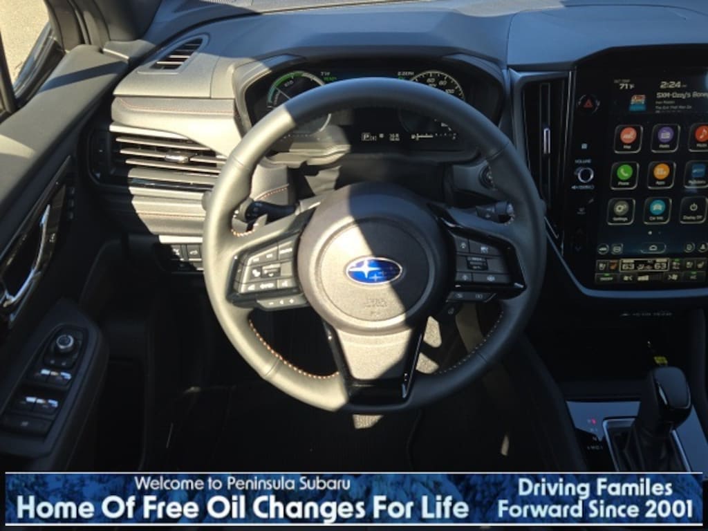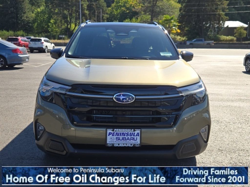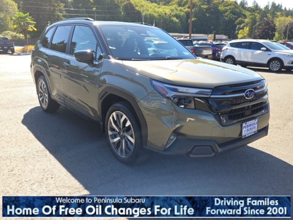 Autumn 2025 Subaru Forester Hybrid Touring AWD Lineartronic CVT 2.5L 4-Cylinder DOHC 16V 2.5L 4-Cylinder DOHC 16V, 11 Speakers, 4-Wheel Disc Brakes, ABS brakes, Air Conditioning, Alloy wheels, AM/FM radio: SiriusXM with 360L, Anti-whiplash front head restraints, Auto High-beam Headlights, Auto-Dimming Exterior Mirror w/Approach Light, Automatic temperature control, Body Side Molding - Autumn Green Metallic, Brake assist, Bumpers: body-color, Cargo Tray, Compass, Door Projector Lights, Driver door bin, Driver vanity mirror, Dual front impact airbags, Dual front side impact airbags, Electronic Stability Control, Emergency communication system: MySubaru Safety (3-year free trial), Exterior Parking Camera Rear, Four wheel independent suspension, Front anti-roll bar, Front Bucket Seats, Front Center Armrest, Front dual zone A/C, Front fog lights, Front reading lights, Fully automatic headlights, harman/kardon® Speakers, Heated & Ventilated Front Bucket Seats, Heated door mirrors, Heated front seats, Heated rear seats, Heated steering wheel, HVAC memory, Illuminated entry, Knee airbag, LED Upgrade, Low tire pressure warning, Memory seat, Navigation system: TomTom Navigation w/what3words, Occupant sensing airbag, Outside temperature display, Overhead airbag, Overhead console, Panic alarm, Passenger door bin, Passenger vanity mirror, Perforated Leather-Trimmed Upholstery, Power door mirrors, Power driver seat, Power Liftgate, Power moonroof: Panoramic, Power passenger seat, Power steering, Power windows, Radio data system, Radio: Subaru 11.6" Multimedia Navigation System, Rear anti-roll bar, Rear seat center armrest, Rear window defroster, Rear window wiper, Remote keyless entry, Security system, Speed control, Speed-sensing steering, Splash Guards, Split folding rear seat, Spoiler, Standard Model, Steering wheel mounted audio controls, Tachometer, Telescoping steering wheel, Tilt steering wheel, Traction control, Trip computer, Turn signal indicator mirrors, Variably intermittent wipers, Ventilated front seats, Wheels: 19" x 7.5 J Dark Gray Aluminum-Alloy, 2.5L 4-Cylinder DOHC 16V.
