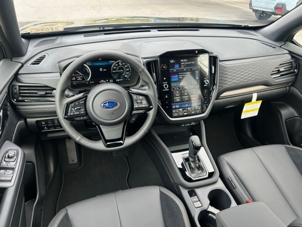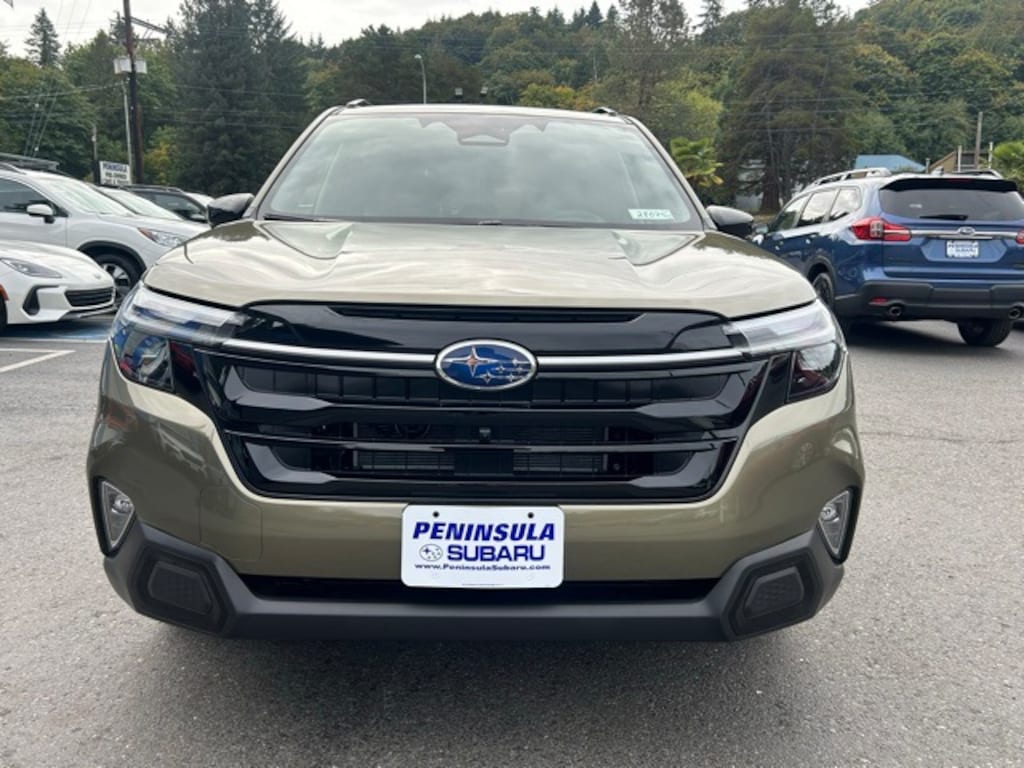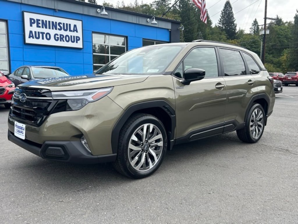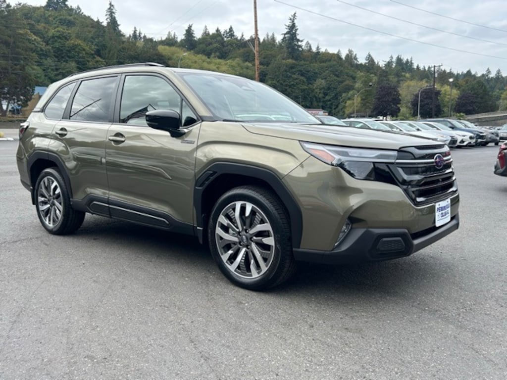Autumn 2025 Subaru Forester Hybrid Touring AWD Lineartronic CVT 2.5L 4-Cylinder DOHC 16V 2.5L 4-Cylinder DOHC 16V, 11 Speakers, 4-Wheel Disc Brakes, ABS brakes, Air Conditioning, Alloy wheels, AM/FM radio: SiriusXM with 360L, Anti-whiplash front head restraints, Auto High-beam Headlights, Auto-Dimming Exterior Mirror w/Approach Light, Automatic temperature control, Body Side Molding - Autumn Green Metallic, Brake assist, Bumpers: body-color, Cargo Tray, Compass, Door Projector Lights, Driver door bin, Driver vanity mirror, Dual front impact airbags, Dual front side impact airbags, Electronic Stability Control, Emergency communication system: MySubaru Safety (3-year free trial), Exterior Parking Camera Rear, Four wheel independent suspension, Front anti-roll bar, Front Bucket Seats, Front Center Armrest, Front dual zone A/C, Front fog lights, Front reading lights, Fully automatic headlights, harman/kardon® Speakers, Heated & Ventilated Front Bucket Seats, Heated door mirrors, Heated front seats, Heated rear seats, Heated steering wheel, HVAC memory, Illuminated entry, Knee airbag, LED Upgrade, Low tire pressure warning, Memory seat, Navigation system: TomTom Navigation w/what3words, Occupant sensing airbag, Outside temperature display, Overhead airbag, Overhead console, Panic alarm, Passenger door bin, Passenger vanity mirror, Perforated Leather-Trimmed Upholstery, Power door mirrors, Power driver seat, Power Liftgate, Power moonroof: Panoramic, Power passenger seat, Power steering, Power windows, Radio data system, Radio: Subaru 11.6" Multimedia Navigation System, Rear anti-roll bar, Rear seat center armrest, Rear window defroster, Rear window wiper, Remote keyless entry, Security system, Speed control, Speed-sensing steering, Splash Guards, Split folding rear seat, Spoiler, Standard Model, Steering wheel mounted audio controls, Tachometer, Telescoping steering wheel, Tilt steering wheel, Traction control, Trip computer, Turn signal indicator mirrors, Variably intermittent wipers, Ventilated front seats, Wheels: 19" x 7.5 J Dark Gray Aluminum-Alloy, 2.5L 4-Cylinder DOHC 16V.