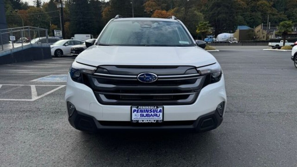 White Pearl 2025 Subaru Forester Hybrid Premium AWD Lineartronic CVT 2.5L 4-Cylinder DOHC 16V 2.5L 4-Cylinder DOHC 16V, 4-Wheel Disc Brakes, 6 Speakers, ABS brakes, Air Conditioning, All-Weather Floor Liners, Alloy wheels, AM/FM radio: SiriusXM with 360L, Anti-whiplash front head restraints, Auto High-beam Headlights, Auto-Dimming Mirror w/Compass & HomeLink, Automatic temperature control, Brake assist, Bumpers: body-color, Cargo Tray, Compass, Driver door bin, Driver vanity mirror, Dual front impact airbags, Dual front side impact airbags, Electronic Stability Control, Emergency communication system: MySubaru Safety (3-year free trial), Exterior Parking Camera Rear, Four wheel independent suspension, Front anti-roll bar, Front Bucket Seats, Front Center Armrest, Front dual zone A/C, Front fog lights, Front reading lights, Fully automatic headlights, Heated door mirrors, Heated Front Bucket Seats, Heated front seats, Illuminated entry, Knee airbag, Low tire pressure warning, Navigation system: TomTom Navigation w/what3words, Occupant sensing airbag, Outside temperature display, Overhead airbag, Overhead console, Panic alarm, Passenger door bin, Passenger vanity mirror, Power door mirrors, Power driver seat, Power Liftgate, Power moonroof: Panoramic, Power steering, Power windows, Premium Cloth Upholstery, Radio data system, Radio: Subaru 11.6" Multimedia Navigation System, Rear anti-roll bar, Rear Bumper Cover, Rear seat center armrest, Rear window defroster, Rear window wiper, Remote keyless entry, Security system, Speed control, Speed-sensing steering, Split folding rear seat, Spoiler, Standard Model, Steering wheel mounted audio controls, Tachometer, Telescoping steering wheel, Tilt steering wheel, Traction control, Trip computer, Variably intermittent wipers, Wheels: 18" x 7.0 J Dark Metallic Aluminum-Alloy, 2.5L 4-Cylinder DOHC 16V.