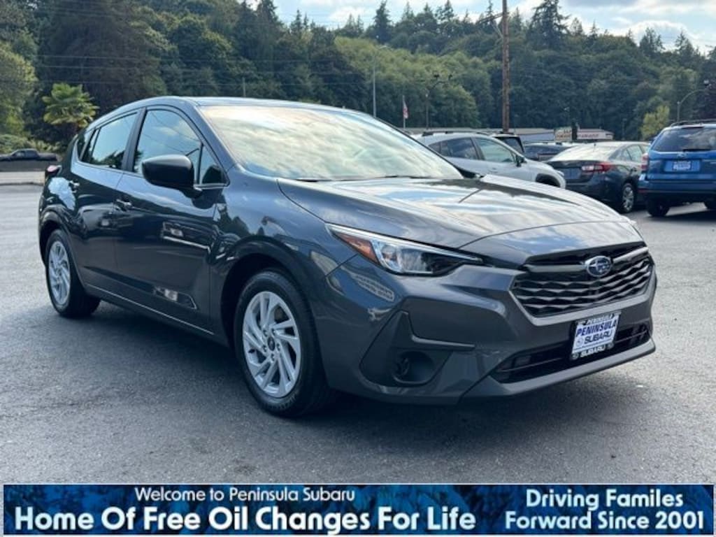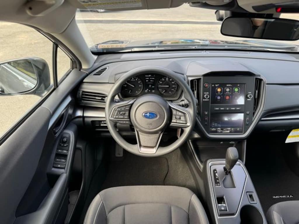 Gray 2025 Subaru Impreza AWD CVT Lineartronic 2.0L DOHC 4 Speakers, 4-Wheel Disc Brakes, ABS brakes, Air Conditioning, AM/FM radio: SiriusXM, Anti-whiplash front head restraints, Auto High-beam Headlights, Automatic temperature control, Brake assist, Bumpers: body-color, Cloth Upholstery, Driver door bin, Driver vanity mirror, Dual front impact airbags, Dual front side impact airbags, Electronic Stability Control, Exterior Parking Camera Rear, Four wheel independent suspension, Front anti-roll bar, Front Bucket Seats, Front Center Armrest, Front dual zone A/C, Front reading lights, Fully automatic headlights, Illuminated entry, Knee airbag, Low tire pressure warning, Occupant sensing airbag, Outside temperature display, Overhead airbag, Overhead console, Panic alarm, Passenger door bin, Passenger vanity mirror, Power door mirrors, Power steering, Power windows, Radio data system, Radio: Subaru Dual 7" Multimedia System, Rear window defroster, Rear window wiper, Remote keyless entry, Security system, Speed control, Speed-sensing steering, Split folding rear seat, Spoiler, Steering wheel mounted audio controls, Tachometer, Telescoping steering wheel, Tilt steering wheel, Traction control, Trip computer, Variably intermittent wipers, Wheels: 16" x 6.0" 1/2J Steel w/Full Cap.