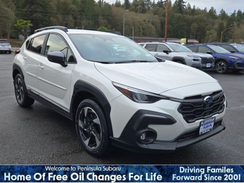 White Pearl 2026 Subaru Crosstrek Limited AWD Lineartronic CVT 2.5L 4-Cylinder DOHC 16V 4-Wheel Disc Brakes, 6 Speakers, ABS brakes, Air Conditioning, Alloy wheels, AM/FM radio: SiriusXM, Anti-whiplash front head restraints, Auto High-beam Headlights, Auto-Dimming Exterior Mirror with Approach Light, Auto-Dimming Mirror with Compass and HomeLink, Automatic temperature control, Brake assist, Bumpers: body-color, Crosstrek Mirror Package, Crystal White Pearl Body Side Molding, Driver door bin, Driver vanity mirror, Dual front impact airbags, Dual front side impact airbags, Electronic Stability Control, Emergency communication system: MySubaru Companion (5-years free), Exterior Parking Camera Rear, Four wheel independent suspension, Front anti-roll bar, Front Bucket Seats, Front Center Armrest, Front dual zone A/C, Front fog lights, Front reading lights, Fully automatic headlights, Heated door mirrors, Heated Front Bucket Seats, Heated front seats, Heated steering wheel, Illuminated entry, Knee airbag, Leather Shift Knob, Leather steering wheel, Leather-Trimmed Upholstery, Low tire pressure warning, Occupant sensing airbag, Outside temperature display, Overhead airbag, Overhead console, Panic alarm, Passenger door bin, Passenger vanity mirror, Power door mirrors, Power driver seat, Power steering, Power windows, Radio data system, Radio: Subaru 11.6" Multimedia Plus System, Rear anti-roll bar, Rear seat center armrest, Rear side impact airbag, Rear window defroster, Rear window wiper, Remote keyless entry, Security system, Speed control, Speed-sensing steering, Splash Guards, Split folding rear seat, Spoiler, Steering wheel mounted audio controls, Tachometer, Telescoping steering wheel, Tilt steering wheel, Traction control, Trip computer, Turn signal indicator mirrors, Variably intermittent wipers, Wheels: 18" x 7.0" J Machine Finish Aluminum-Alloy.