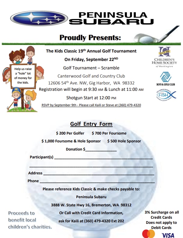 Please RSVP by September 9th to reserve your spot at Peninsula Subaru's 18th Annual Kids Golf Tournament, taking place at Canterwood Golf and Country Club on Friday, September 16th. We look forward to seeing you there!