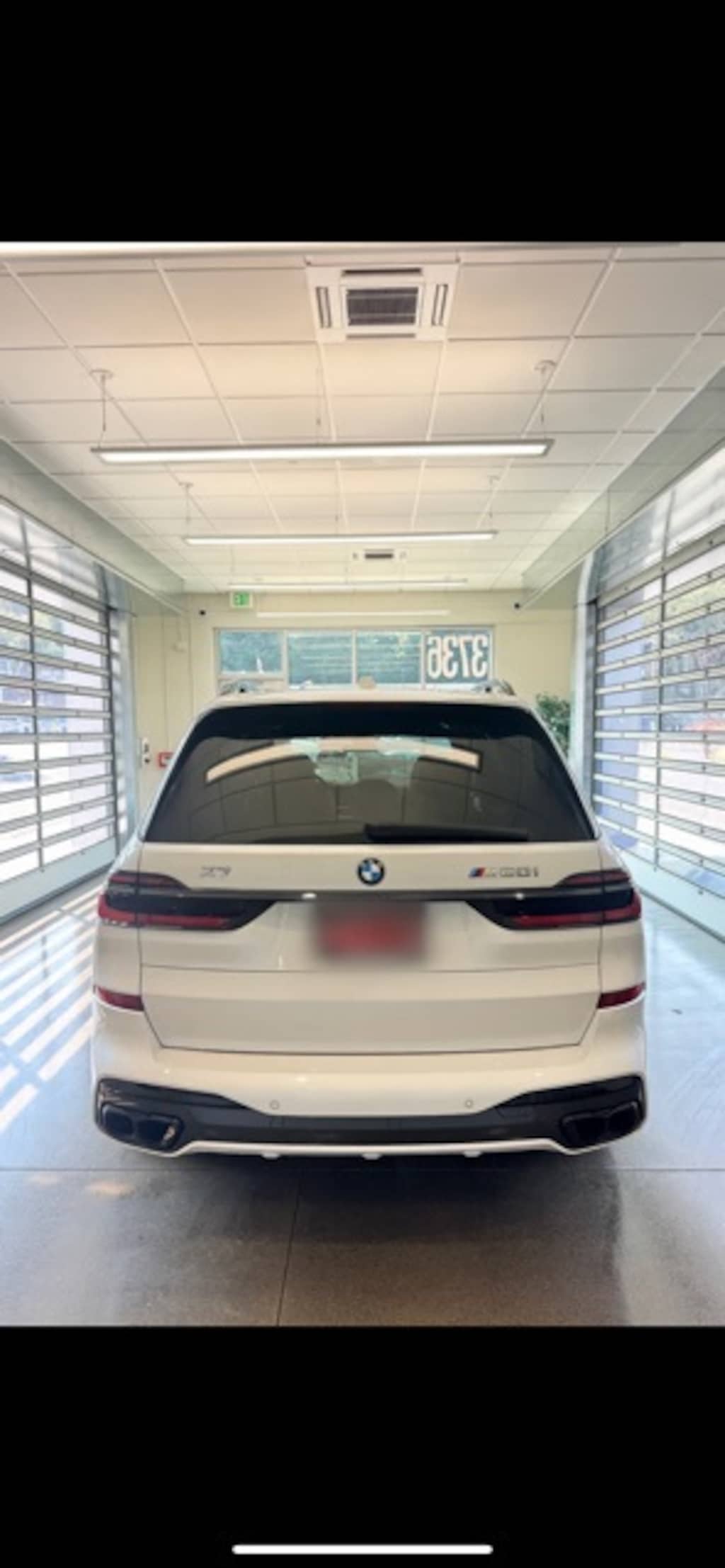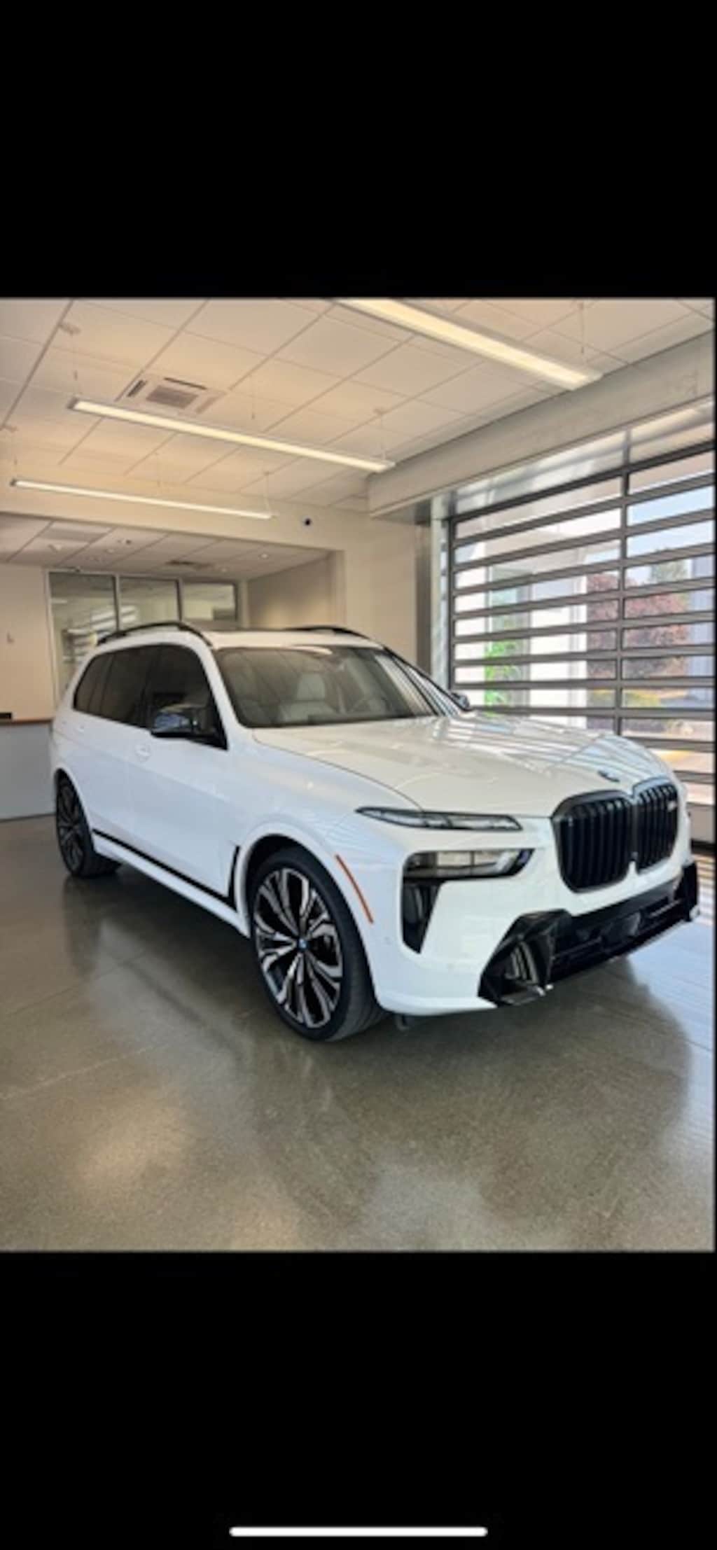 16 Speakers, 3.15 Axle Ratio, 3rd row seats: split-bench, 4-Wheel Disc Brakes, ABS brakes, Adaptive suspension, Air Conditioning, Alloy wheels, AM/FM radio: SiriusXM with 360L, AM/FM Stereo, Apple CarPlay & Android Auto Compatibility, Apple CarPlay Compatibility, Auto High-beam Headlights, Auto tilt-away steering wheel, Auto-dimming door mirrors, Auto-dimming Rear-View mirror, Auto-leveling suspension, Automatic temperature control, BMW Assist eCall, BMW TeleServices, Brake assist, Bumpers: body-color, Compass, Connected Package Pro, ConnectedDrive Services, Delay-off headlights, Door auto-latch, Driver door bin, Driver vanity mirror, Dual front impact airbags, Dual front side impact airbags, Electronic Stability Control, Emergency communication system: BMW Assist eCall, Extended Merino Leather Upholstery, Exterior Parking Camera Rear, Four wheel independent suspension, Front anti-roll bar, Front Bucket Seats, Front Center Armrest, Front dual zone A/C, Front reading lights, Fully automatic headlights, Garage door transmitter, Genuine wood console insert, Genuine wood dashboard insert, Genuine wood door panel insert, Gesture Control, harman/kardon Surround Sound System, harman/kardon® Speakers, Head restraints memory, Heads-Up Display, Heated door mirrors, Heated front seats, Heated Multi-Contour Seats, Heated steering wheel, Illuminated entry, Knee airbag, Leather steering wheel, Live Cockpit Pro, Low tire pressure warning, Memory seat, Navigation system: BMW Maps Navigation, Occupant sensing airbag, Outside temperature display, Overhead airbag, Panic alarm, Passenger door bin, Passenger vanity mirror, Personal eSIM 5G, Power adjustable front head restraints, Power door mirrors, Power driver seat, Power Front Seats, Power moonroof: Panorama, Power passenger seat, Power steering, Power windows, Radio data system, Rain sensing wipers, Rear air conditioning, Rear anti-roll bar, Rear dual zone A/C, Rear reading lights, Rear seat center armrest, Rear window defroster, Rear window wiper, Reclining 3rd row seat, Remote keyless entry, Security system, SiriusXM w/360L & 1 Year Platinum Plan Subscription, Speed control, Speed-sensing steering, Speed-Sensitive Wipers, Split folding rear seat, Spoiler, Sport steering wheel, Steering wheel memory, Steering wheel mounted audio controls, Tachometer, Telescoping steering wheel, Tilt steering wheel, Traction control, Trip computer, Turn signal indicator mirrors, Variably intermittent wipers, Wheels: 22" x 9.5" Fr & 22" x 10.5" Rr Double-Spoke, Wireless Charging Device. 2024 BMW X7 M60i White AWD 4.4L V8 DOHC 32V 8-Speed Automatic Sport