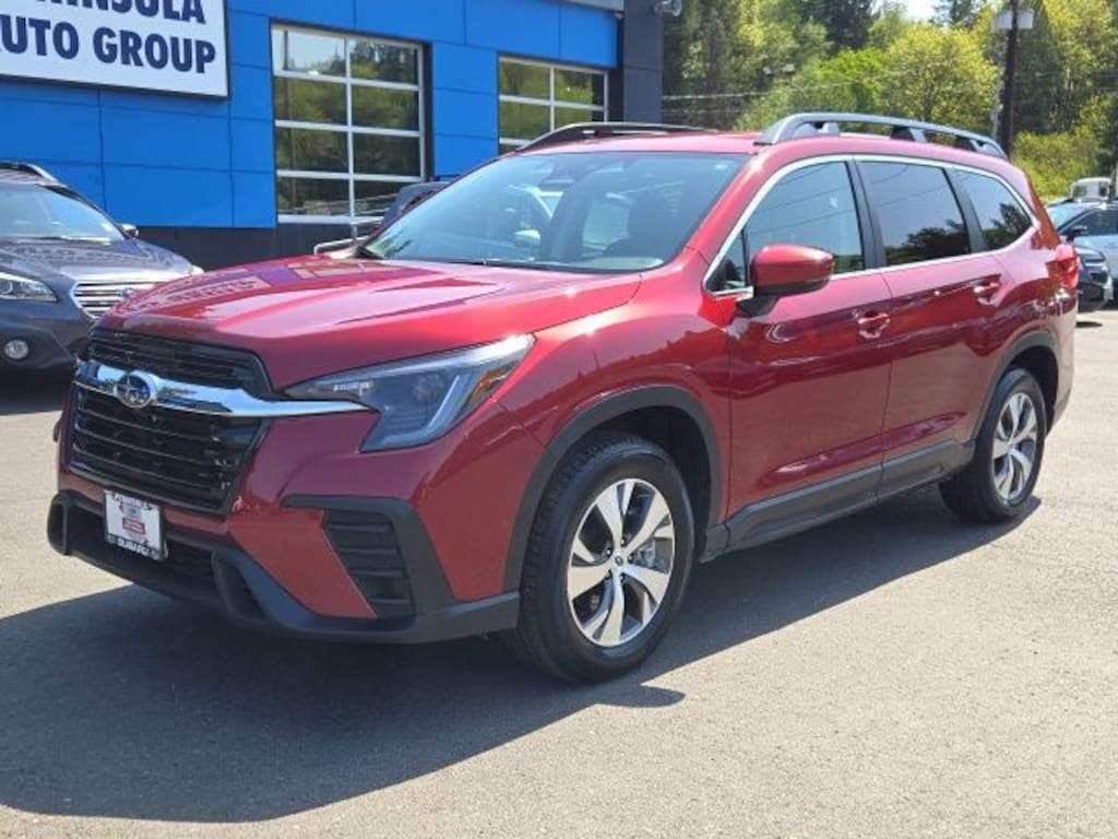 3rd row seats: bench, 4-Wheel Disc Brakes, 6 Speakers, ABS brakes, Air Conditioning, Alloy wheels, AM/FM radio: SiriusXM, Auto High-beam Headlights, Auto-Dimming Rear View Compass Mirror w/HomeLink, Automatic temperature control, Axle Ratio: 4.44, Brake assist, Bumpers: body-color, Convenience Package, Delay-off headlights, Driver door bin, Driver vanity mirror, Dual front impact airbags, Dual front side impact airbags, Electronic Stability Control, Emergency communication system: STARLINK Safety and Security (Subscription Required), Exterior Parking Camera Rear, Four wheel independent suspension, Front anti-roll bar, Front Bucket Seats, Front Center Armrest, Front dual zone A/C, Front reading lights, Fully automatic headlights, Heated door mirrors, Heated Front Bucket Seats, Heated front seats, Illuminated entry, Keyless Access w/Push-Button Start, Knee airbag, Leather Shift Knob, Leather steering wheel, Low tire pressure warning, Occupant sensing airbag, Outside temperature display, Overhead airbag, Overhead console, Panic alarm, Passenger door bin, Passenger vanity mirror, Power door mirrors, Power driver seat, Power Rear Gate w/Automatic Close & Height Memory, Power steering, Power windows, Radio data system, Radio: Subaru STARLINK 11.6" Multimedia Plus System, Rear air conditioning, Rear anti-roll bar, Rear reading lights, Rear window defroster, Rear window wiper, Reclining 3rd row seat, Remote keyless entry, Reverse Automatic Braking (RAB) System, Security system, Speed control, Speed-sensing steering, Spill Resistant Coated Cloth Upholstery, Split folding rear seat, Spoiler, STARLINK/Apple CarPlay/Android Auto, Steering wheel mounted audio controls, Tachometer, Telescoping steering wheel, Tilt steering wheel, Traction control, Trip computer, Turn signal indicator mirrors, Variably intermittent wipers, Wheels: 18" x 7.5 J Gray Alloy w/Machine Finish. 2024 Subaru Ascent Premium Crimson Red Pearl AWD 2.4L 4-Cylinder DOHC 16V Lineartronic CVT