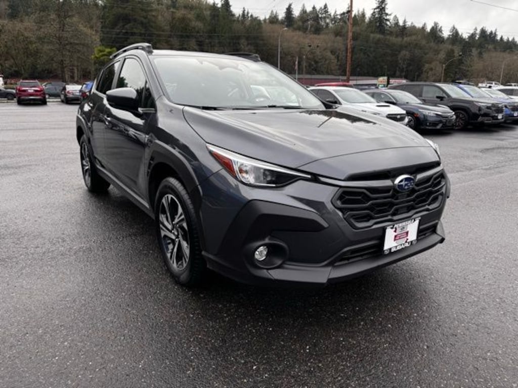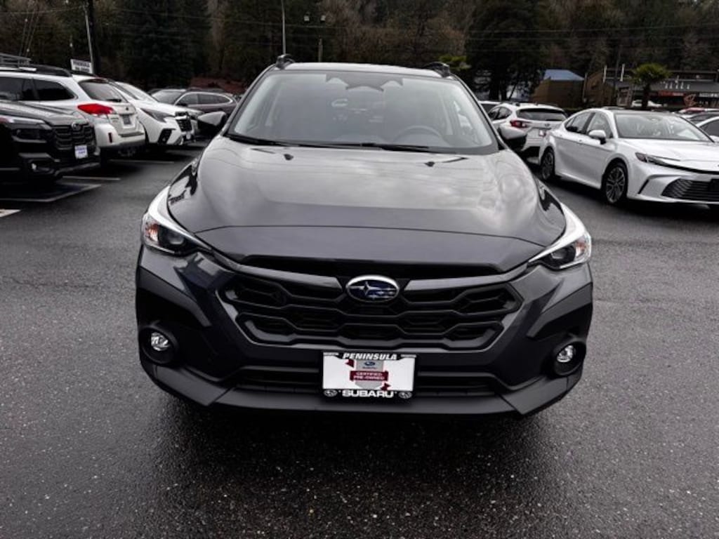 10-Way Power Driver's Seat, 4-Wheel Disc Brakes, 6 Speakers, ABS brakes, Air Conditioning, All-Weather Package, Alloy wheels, AM/FM radio: SiriusXM, Anti-whiplash front head restraints, Auto High-beam Headlights, Auto-Dimming Exterior Mirror w/Approach Light, Auto-Dimming Mirror w/Compass & HomeLink, Automatic temperature control, Blind Spot Detection (BSD), Brake assist, BSD/RCTA & All Wthr Pkg & Pwr Dr. Seat & Pwr Moonrf, Bumpers: body-color, Cloth Upholstery, Crosstrek Mirror Package, Driver door bin, Driver vanity mirror, Dual front impact airbags, Dual front side impact airbags, Dual-Mode Heated Front Seats, Electronic Stability Control, Emergency communication system, Exterior Parking Camera Rear, Four wheel independent suspension, Front anti-roll bar, Front Bucket Seats, Front Center Armrest, Front dual zone A/C, Front fog lights, Front reading lights, Fully automatic headlights, Heated Power Exterior Mirrors, Illuminated entry, Knee airbag, LED Upgrade, Low tire pressure warning, Occupant sensing airbag, Outside temperature display, Overhead airbag, Overhead console, Panic alarm, Passenger door bin, Passenger vanity mirror, Power door mirrors, Power Moonroof, Power steering, Power windows, Radio data system, Radio: Subaru 11.6" Multimedia Plus System, Rear anti-roll bar, Rear Cross-Traffic Alert (RCTA) System, Rear seat center armrest, Rear window defroster, Rear window wiper, Remote keyless entry, Security system, Speed control, Speed-sensing steering, Split folding rear seat, Spoiler, Steering wheel mounted audio controls, Tachometer, Telescoping steering wheel, Tilt steering wheel, Traction control, Trip computer, Turn signal indicator mirrors, Variably intermittent wipers, Wheels: 17" x 7.0" J Machine Finish Aluminum-Alloy, Windshield De-Icer Wipers. 2025 Subaru Crosstrek Premium Gray Metallic AWD 2.5L 4-Cylinder DOHC 16V Lineartronic CVT