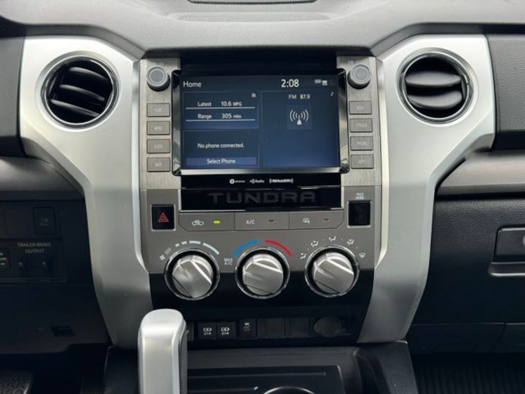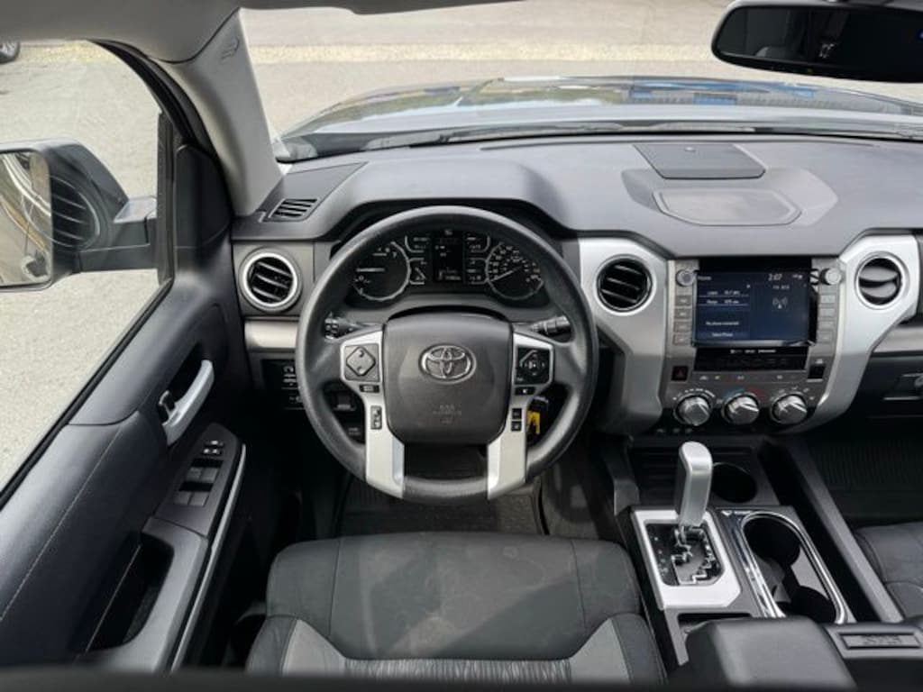 Black Cloth, 18" x 8J Styled Steel Wheels, 3-Passenger Front Bench Seat, 38 Gallon Fuel Tank Capacity, 4-Wheel Disc Brakes, 4.30 Axle Ratio, 7 Speakers, ABS brakes, Air Conditioning, All Weather Floor Liners/Door Sill Protector (TMS), AM/FM radio: SiriusXM, Anti-Theft Immobilizer w/Alarm, Apple CarPlay/Android Auto, Auto High-beam Headlights, Auto-dimming Rear-View mirror, Brake assist, Chrome Exhaust Tip (TMS), Delay-off headlights, Driver door bin, Driver vanity mirror, Dual front impact airbags, Dual front side impact airbags, Electronic Stability Control, Emergency communication system: Safety Connect with 1-year trial, Exterior Parking Camera Rear, Fabric Seat Trim, Front anti-roll bar, Front Bucket Seats, Front Center Armrest w/Storage, Front Fog & Driving Lights, Front fog lights, Front reading lights, Front wheel independent suspension, Fully automatic headlights, Garage door transmitter: HomeLink, Heated door mirrors, Illuminated entry, Illuminated Entry System, Knee airbag, Low tire pressure warning, Occupant sensing airbag, Outside temperature display, Overhead airbag, Overhead console, Panic alarm, Passenger door bin, Passenger vanity mirror, Power door mirrors, Power steering, Power windows, Predator Steps (TMS), Radio data system, Radio: Audio Plus AM/FM/HD Radio, Rear reading lights, Rear step bumper, Rear Under Seat Storage Tray, Remote keyless entry, Remote Tailgate Lock (TMS), Safety Connect, SiriusXM Radio, Sliding Rear Window w/Privacy Glass, Speed control, Speed-sensing steering, Split folding rear seat, SR5 Package, SR5 Upgrade Package, Stainless Steel Door Edge Guard (TMS), Steering wheel mounted audio controls, Tachometer, Tilt steering wheel, Traction control, Trip computer, Urethane Tilt/Telescopic 4-Spoke Steering Wheel, Variably intermittent wipers, Voltmeter, Black Cloth. 2021 Toyota Tundra SR5 Gray RWD i-Force 5.7L V8 DOHC 32V LEV 6-Speed Automatic Electronic with Overdrive
