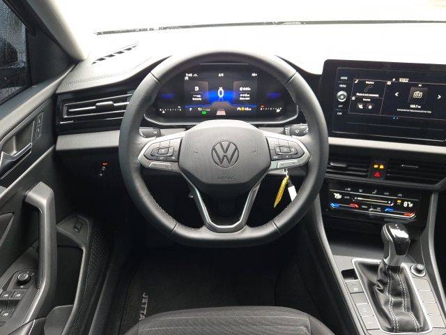 Cloth, 4 Speakers, 4-Wheel Disc Brakes, ABS brakes, Active Blind Spot Monitor, Air Conditioning, Alloy wheels, Auto-dimming Rear-View mirror, Automatic temperature control, Brake assist, Bumpers: body-color, Cloth Seat Trim, Delay-off headlights, Driver door bin, Driver vanity mirror, Dual front impact airbags, Dual front side impact airbags, Electronic Stability Control, Emergency communication system: VW Car-Net Safe & Secure 5-year, Exterior Parking Camera Rear, Front anti-roll bar, Front Bucket Seats, Front Center Armrest, Front dual zone A/C, Front Seats, Front wheel independent suspension, Fully automatic headlights, Heated door mirrors, Illuminated entry, Leather Shift Knob, Leather steering wheel, Low tire pressure warning, Occupant sensing airbag, Outside temperature display, Overhead airbag, Overhead console, Panic alarm, Passenger door bin, Passenger vanity mirror, Power door mirrors, Power steering, Power windows, Radio data system, Radio: MIB3 Composition Color w/8" Touchscreen, Rain sensing wipers, Rear anti-roll bar, Rear reading lights, Rear window defroster, Remote keyless entry, Speed control, Speed-sensing steering, Split folding rear seat, Steering wheel mounted audio controls, Tachometer, Telescoping steering wheel, Tilt steering wheel, Traction control, Trip computer, Variably intermittent wipers, Wheels: 16" 2-Tone Machined Alloy, Cloth. 2025 Volkswagen Jetta 1.5T S Black FWD 1.5L I-4 DI DOHC Turbocharged 8-Speed Automatic with Tiptronic